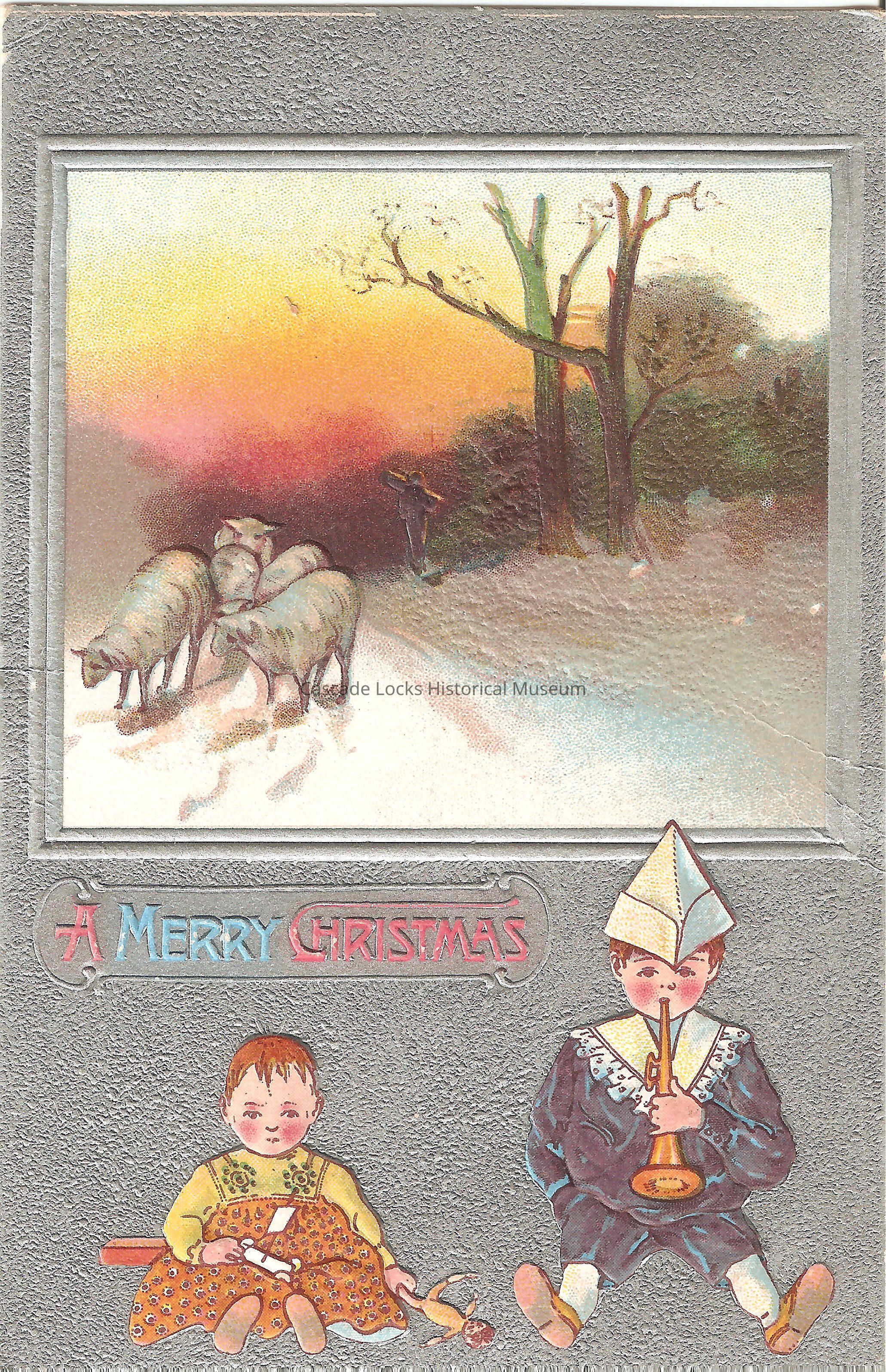 Post Card, illustrated image of a snow-scape with a herd of sheep with a human silhouette. The boarder of the card is silver with two children playing with toys on the bottom on the card. Above the children on the bottom of the card reads, "A Merry Christmas."