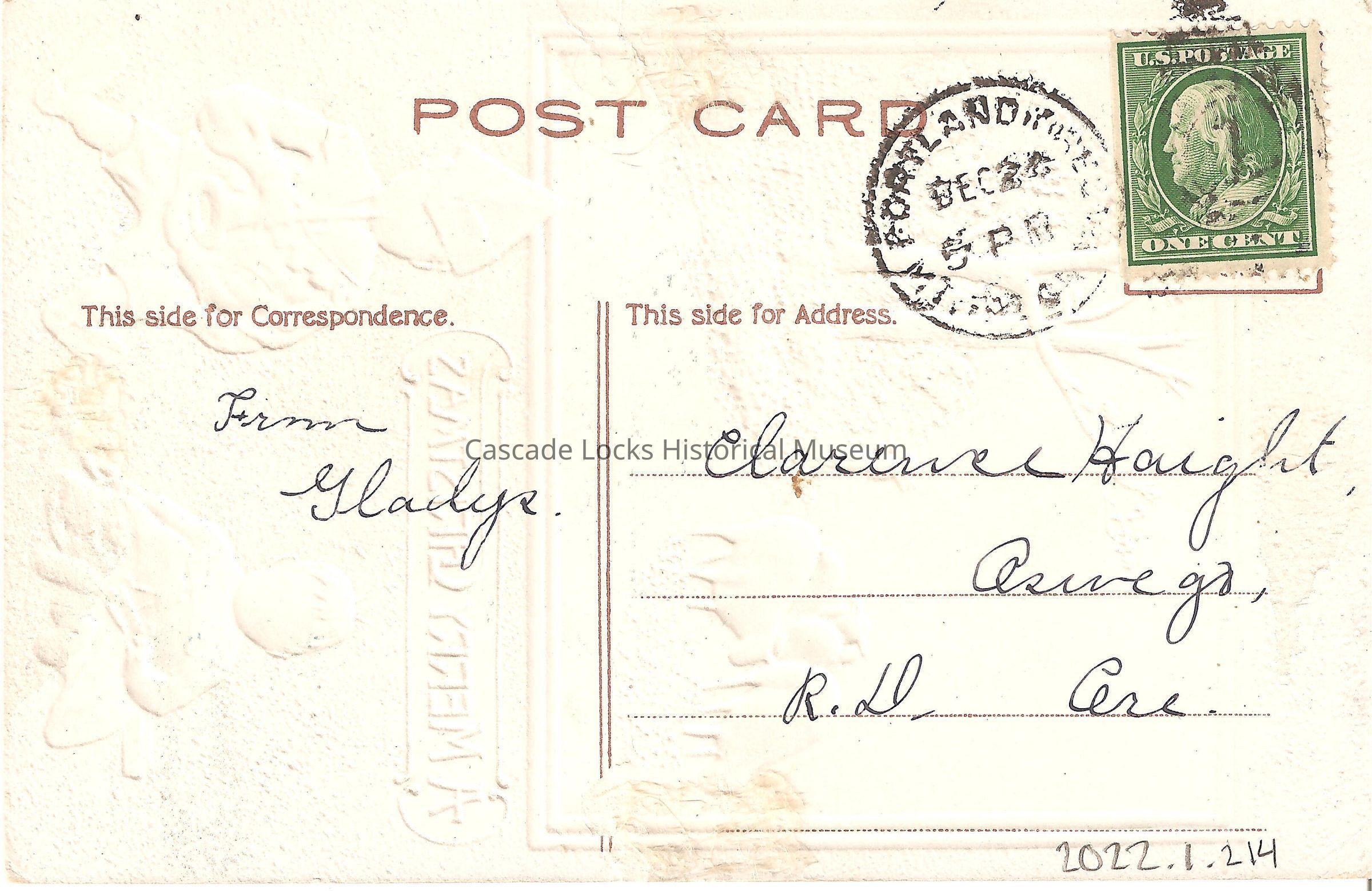 Back of image reads, "Post Card- This side for Correspondence- From Gladys. This side for Address- Clarence Haight, Oswego, Oregon. R.D. Portland, Ore. Dec 2-, 5-PM, (?). U.S. Postage, One Cent."Lexicon