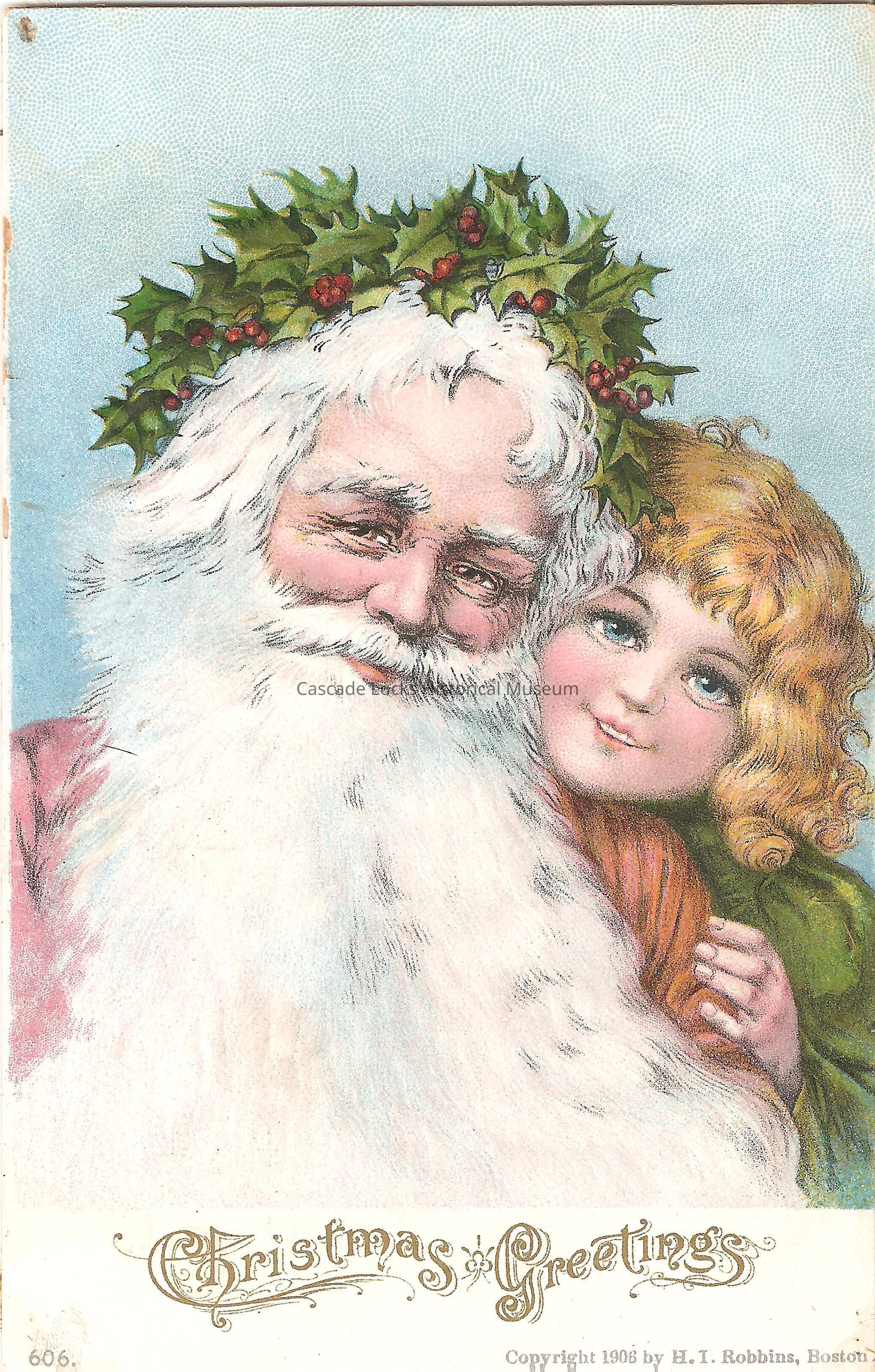 Post Card, illustrated image of Santa Claus wearing a crown of holly and in a portrait pose with a blonde child. Bottom of card reads, "Christmas Greetings, Copywrite 1906 by H. I. Robbins, Boston."