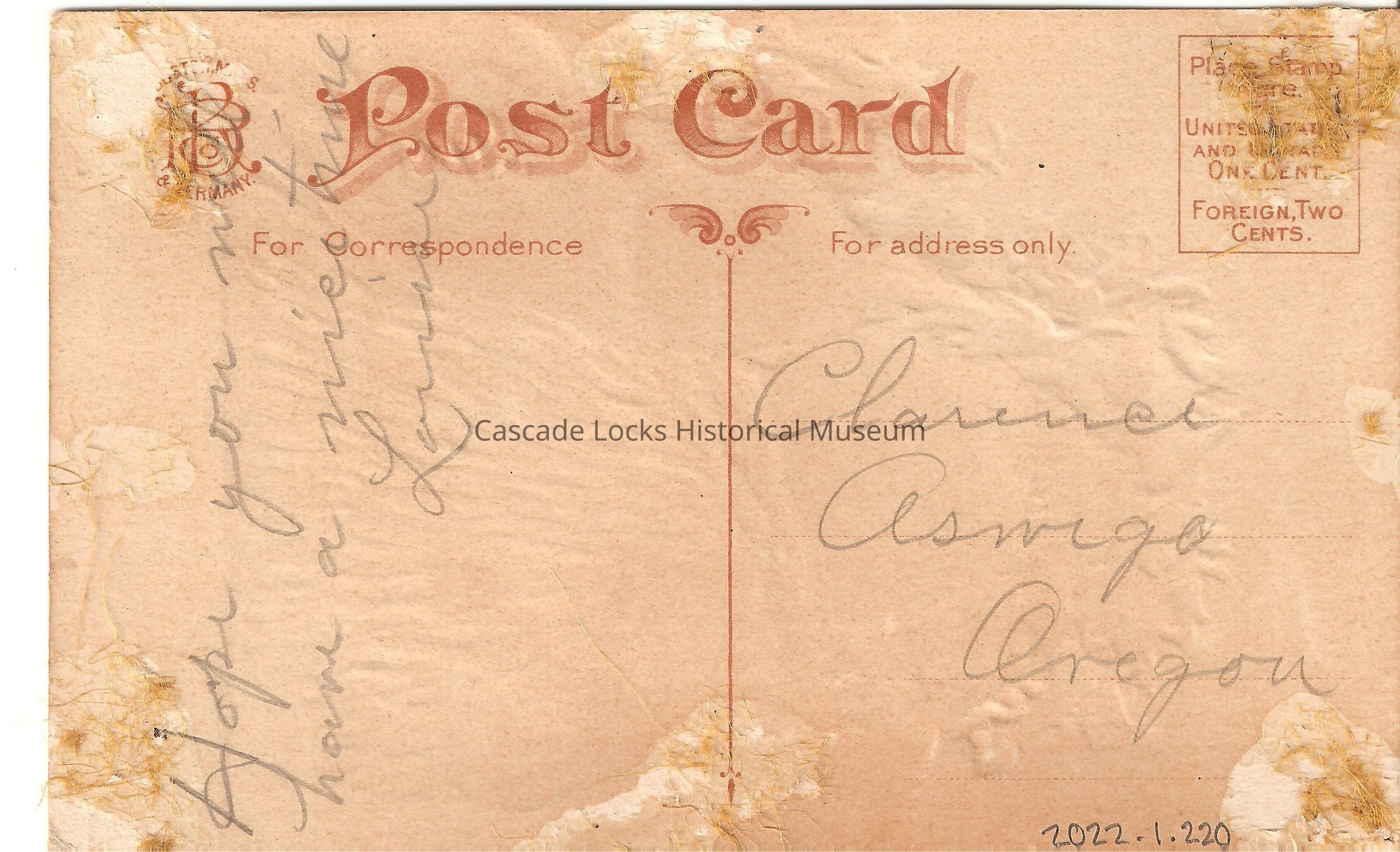 Back of image reads, "Post Card- For Correspondence- Hope you will have a nice time. For Address Only- Clarence Oswego, Oregon. Place Stamp Here, United States and Canada One Cent, Foreign Two Cents. (Makers Mark) (?) & Germany."Lexicon