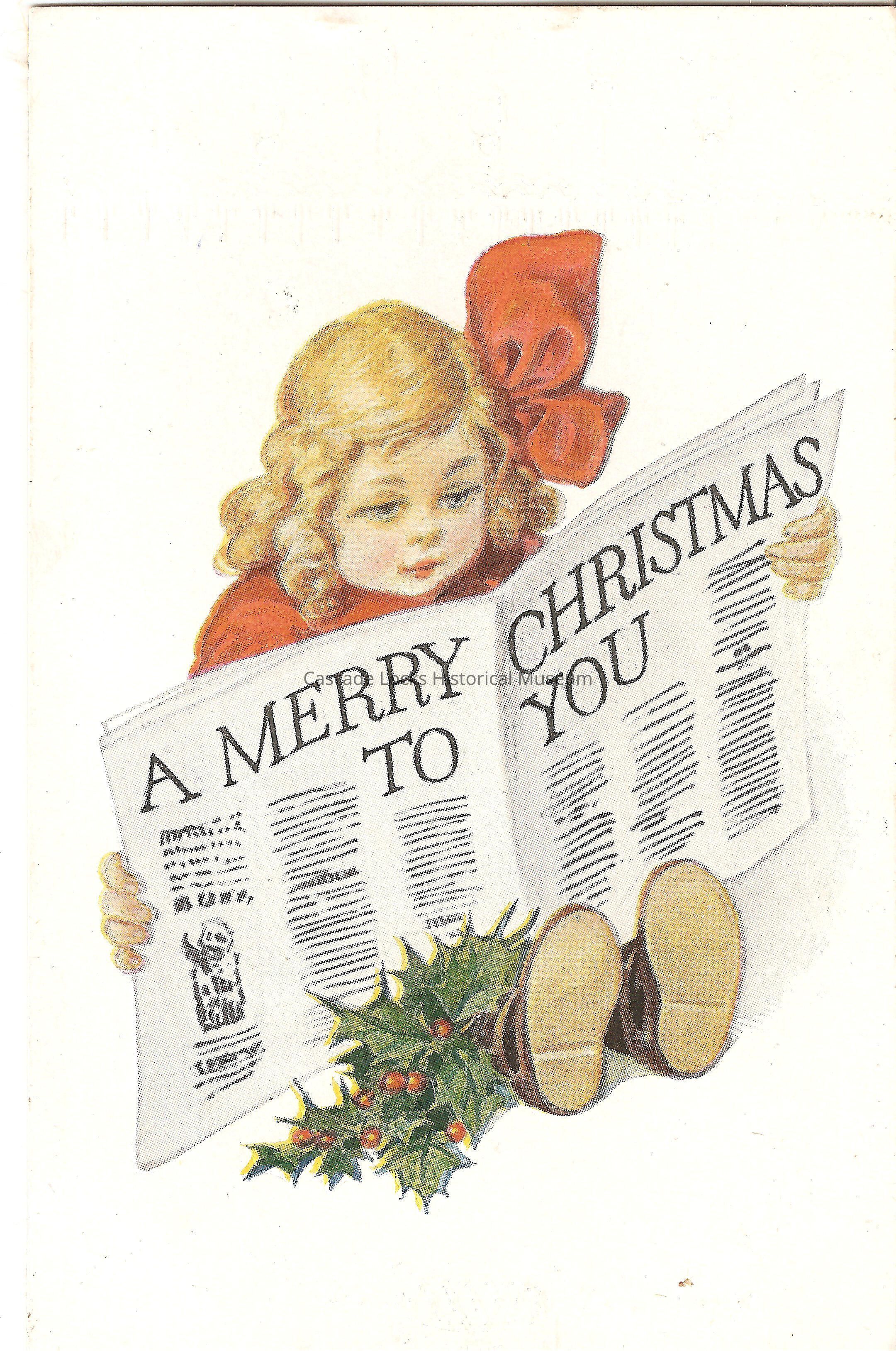 Post Card, illustrated image of a young girl reading a news paper with the title, "A Merry Christmas to you." On the girls legs is bunches of holly.
