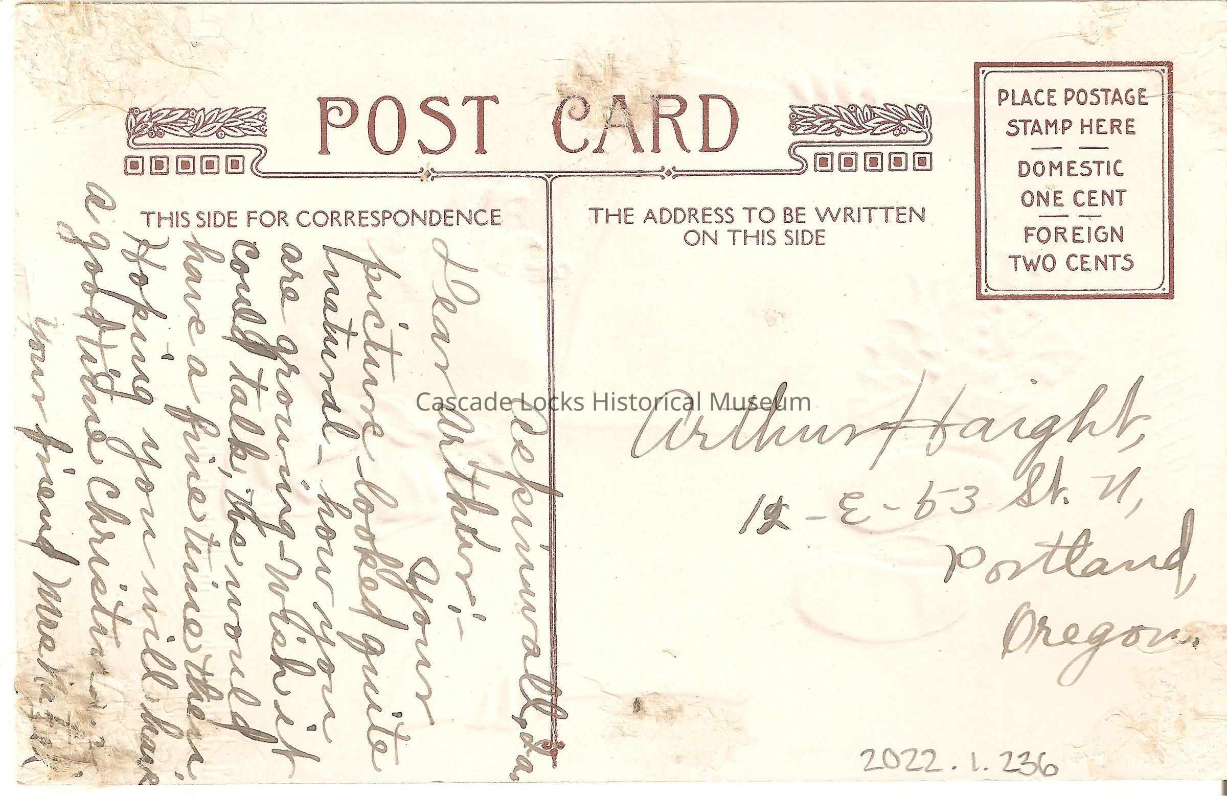 Back of image reads, "Post Card, This Side For Correspondence-Dear Arthur, Your picture looked quite natural. How are you growing. Wish it could talk, we would have a fine time then. Hoping you will have a good time Christmas, your friend Mrs. Mabel. The Address To Be Written On This Side- Arthur Haight, 12 E 53 St. N, Portland, Oregon. Place Postage Stamp Here, Domestic One Cent, Foreign Two Cents"Lexicon