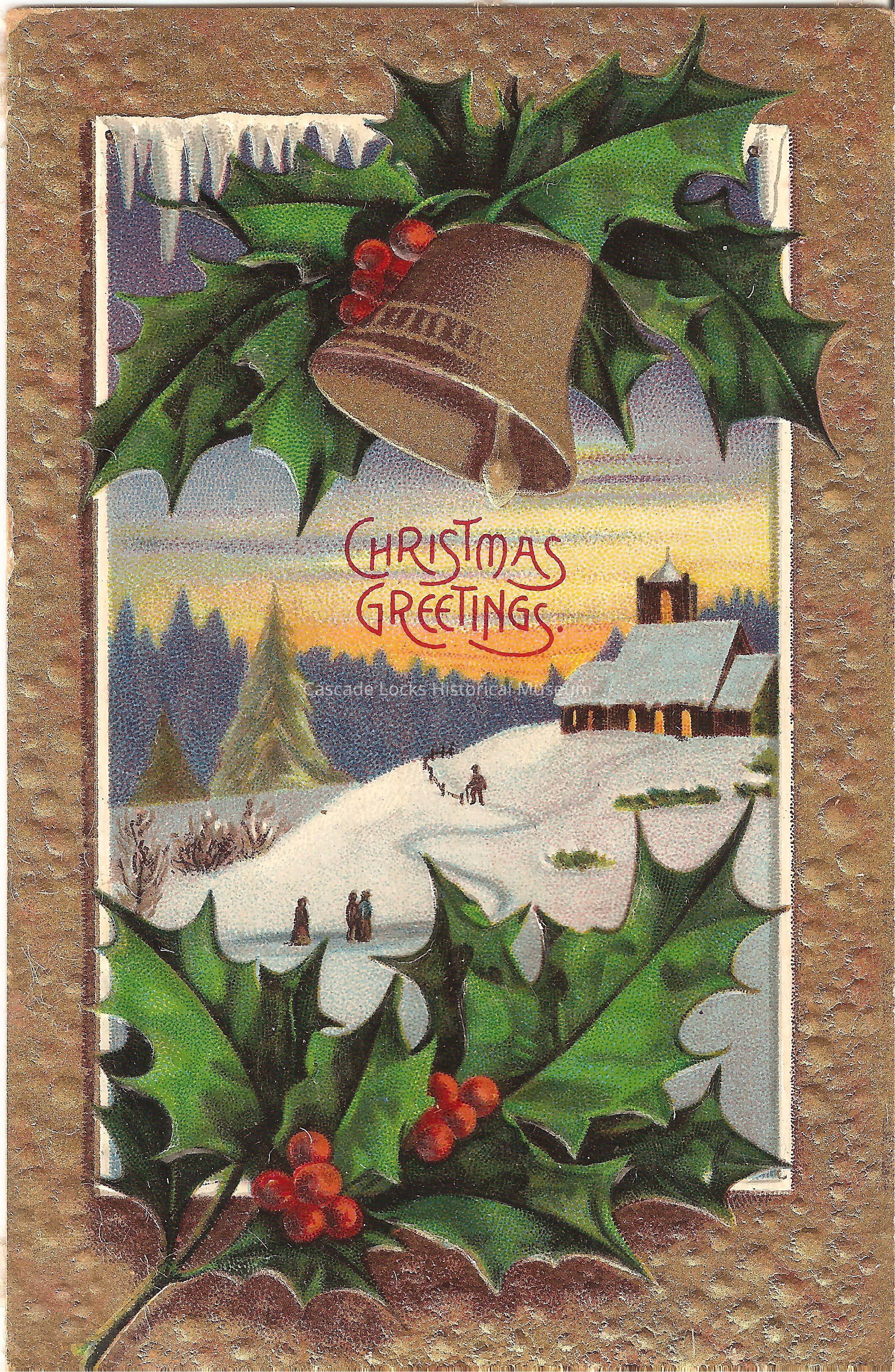 Post Card, illustrated image of a snowy landscape with a church on a hill with people walking up to it. Boarder of image is gold with textured bumps and holly with a bell. Middle of image reads, "Christmas Greetings."