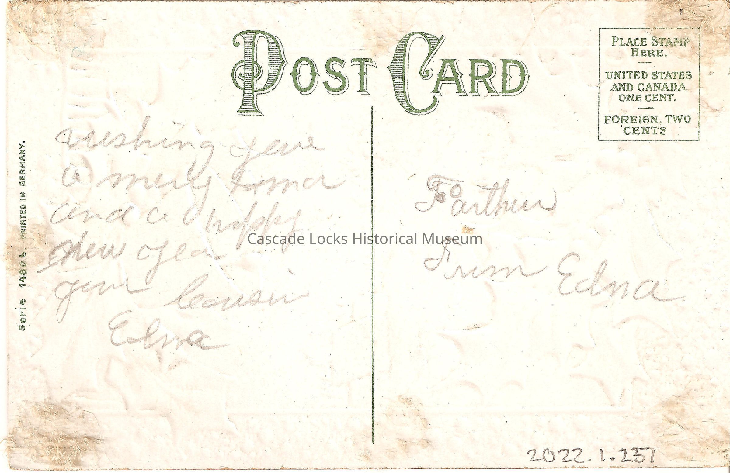 Back of image reads, "Post Card, Series 14806, Printed in Germany. Place Stamp Here. United States and Canada One Cent. Foreign Two Cents. Wishing you a merry Xmas and a Happy New Year Your Cousin Edna. To Arthur From Edna."Lexicon