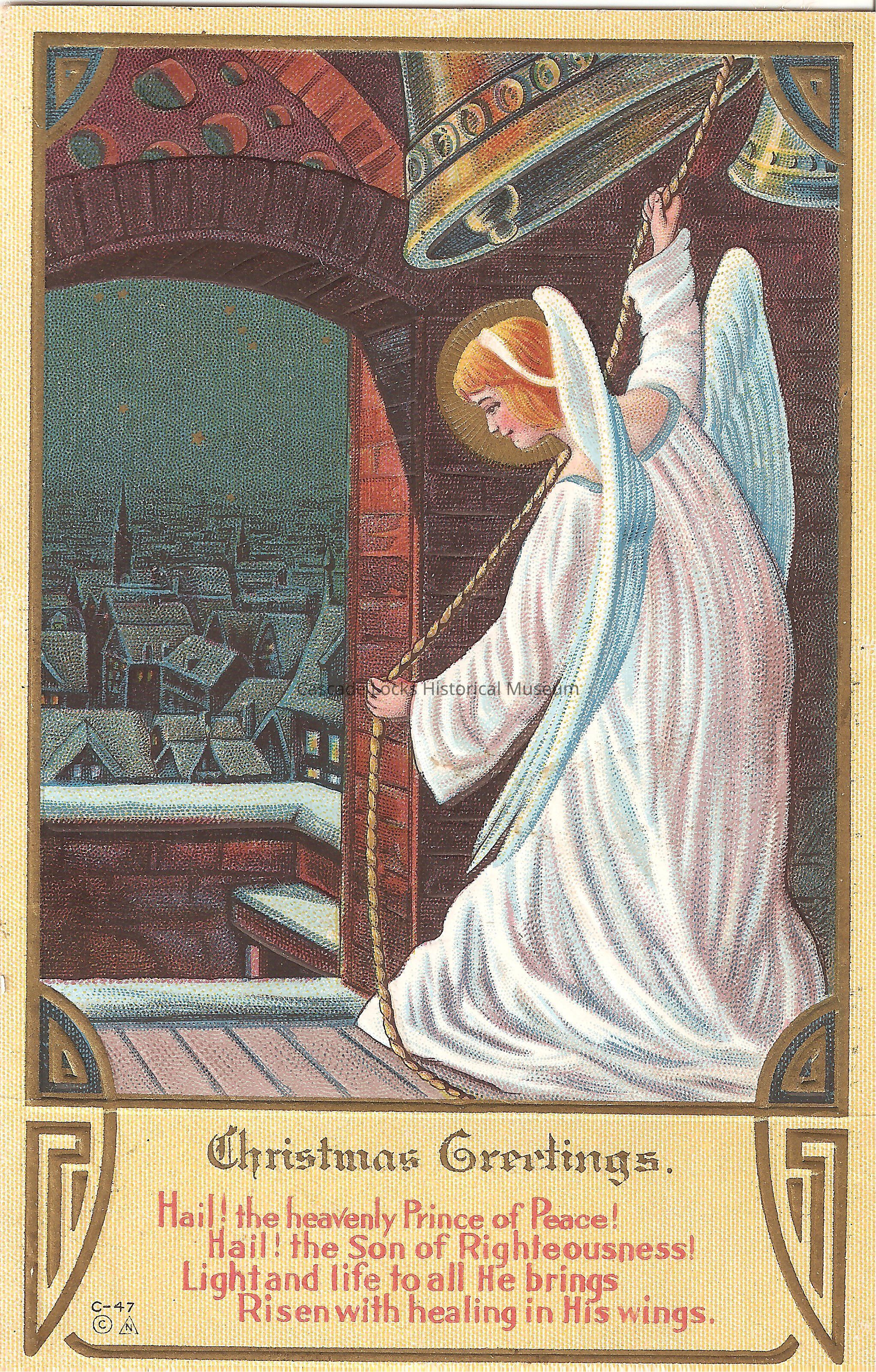 Post Card, illustrated image of an angel ringing a bell for a town. The bottom of the image reads, "Christmas Greetings. Hail! the Heavenly Prince of Peace. Hail! The son of Righteousness. Light and life to all He brings, Risen with healing in His wings."
