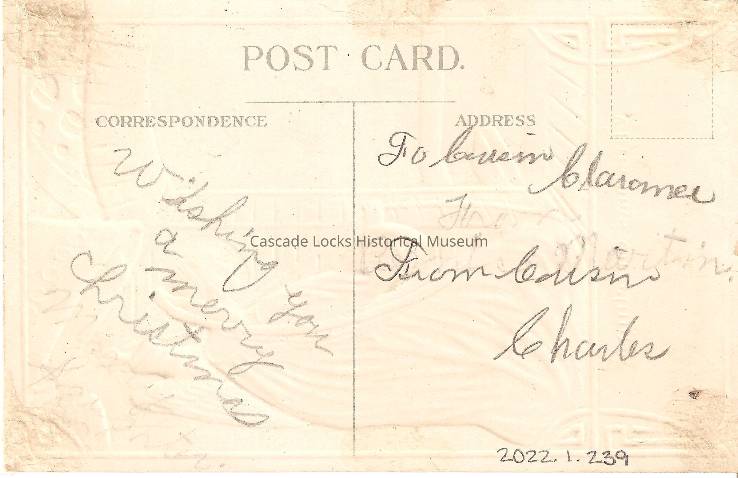 Back of image reads, "Post Card, Correspondence- Wishing you a Merry Christmas, Address- To Cousin Clarence, From Cousin Charles."Lexicon
