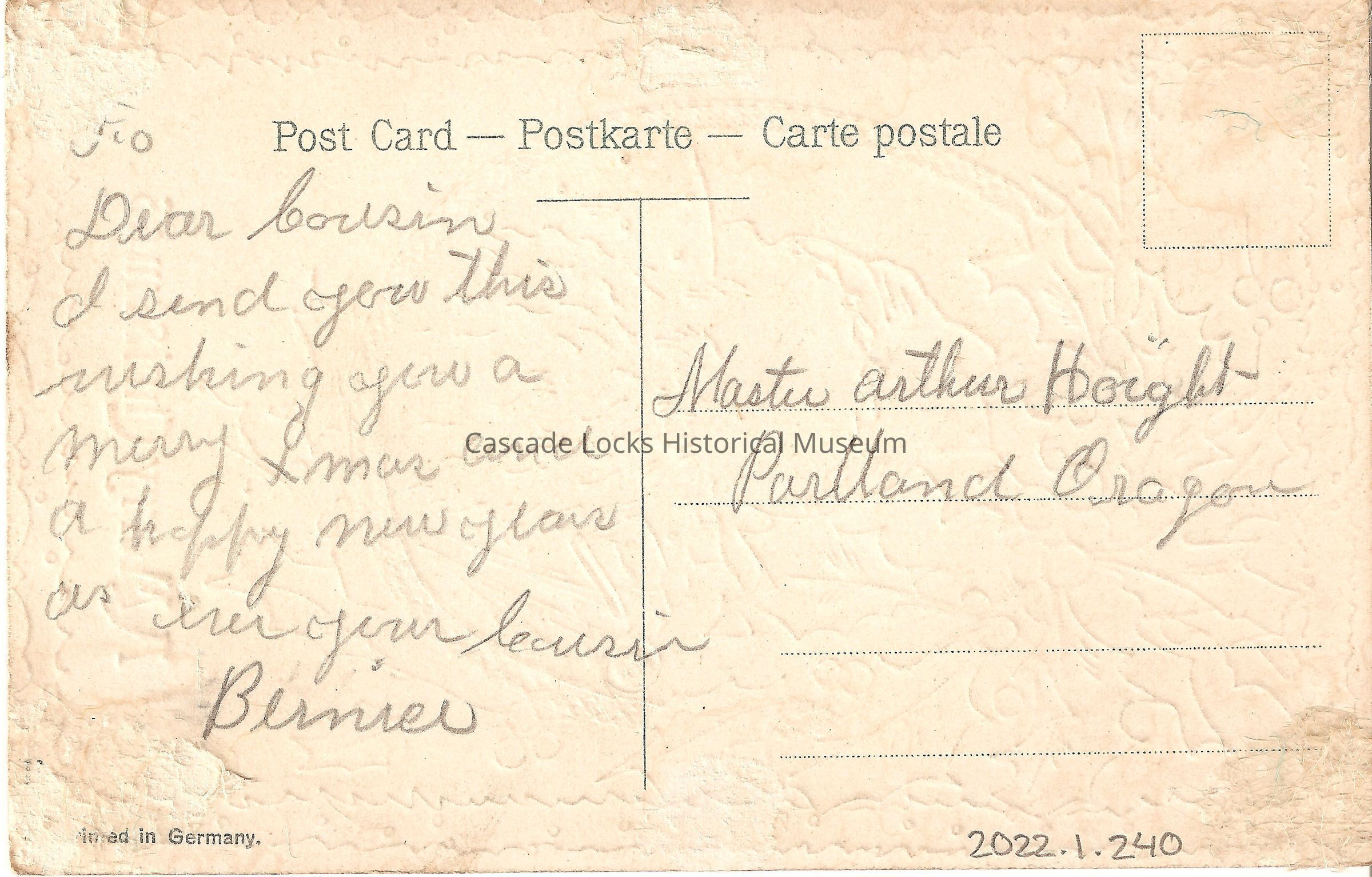 Back of image reads," Post Card, Postkarte, Carte Postale. Made in Germany. Master Arthur Haight, Portland, Oregon. Dear Cousin, I sent you this wishing you a Merry Xmas and a Happy New Year as ever your cousin, -Bernice."Lexicon