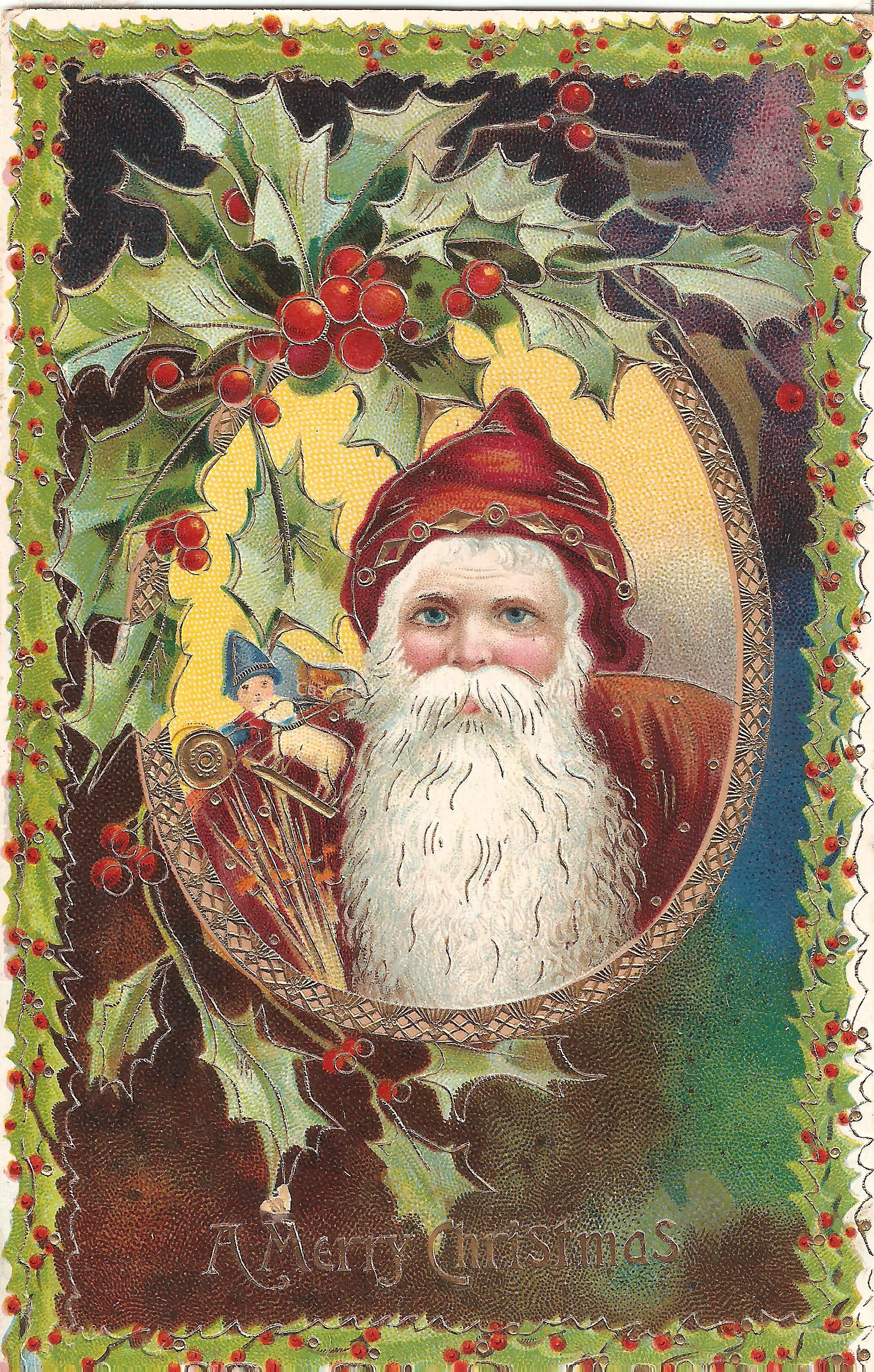 Post Card, illustrated image of Santa Claus in a red robe with a large white beard. The boarder of the image is made of holly. The bottom front of the card reads, "Merry Christmas Greetings."