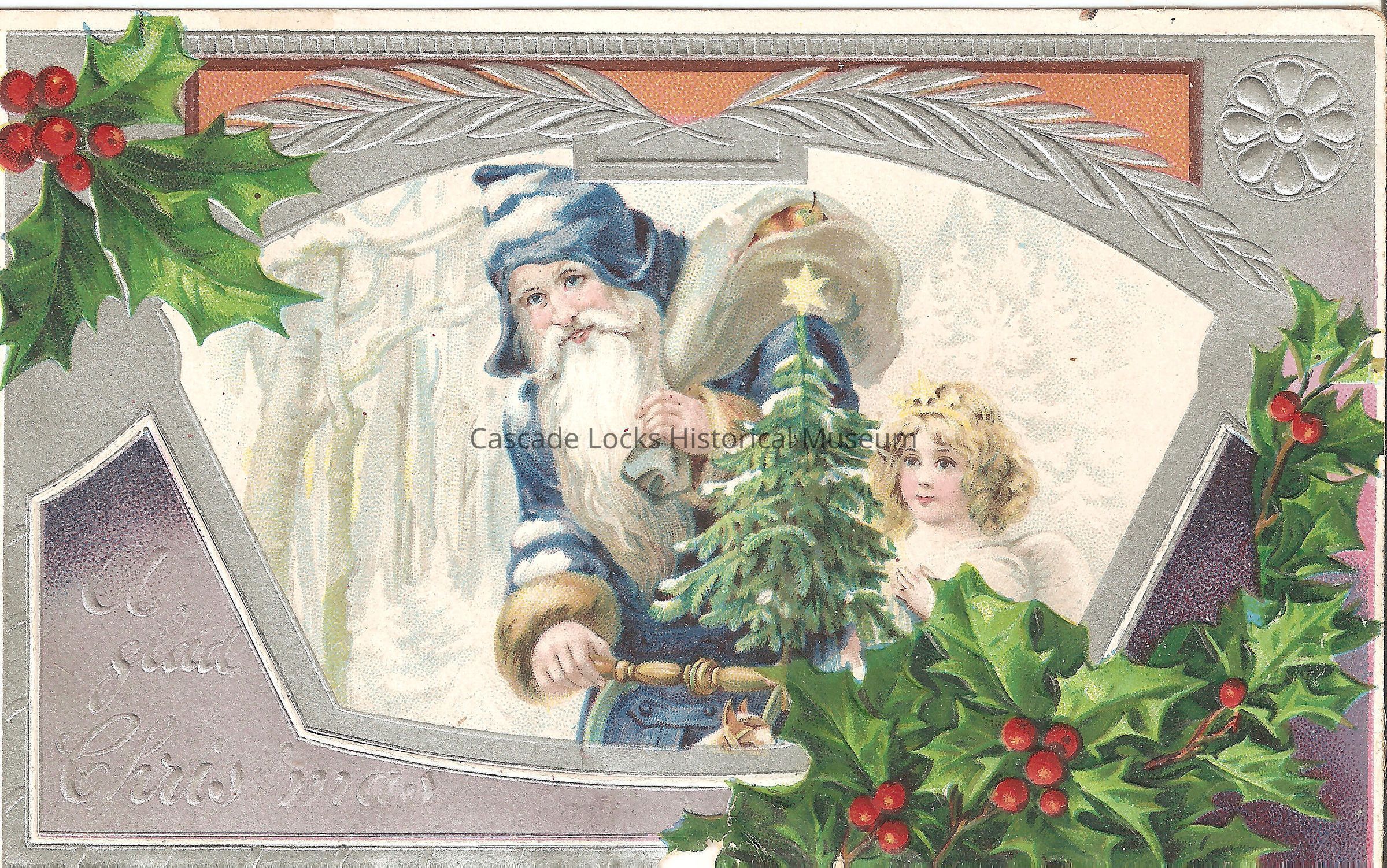 Post Card, illustrated image of Santa Claus in a blue robe with fur trim sleeves and he has a bag thrown over his shoulder. There is a girl dressed like an angel holding a small Christmas tree. The boarder around the edges are gray/silver and there is holly in the top left and bottom right corners. The bottom left corner reads, "A glad Christmas."