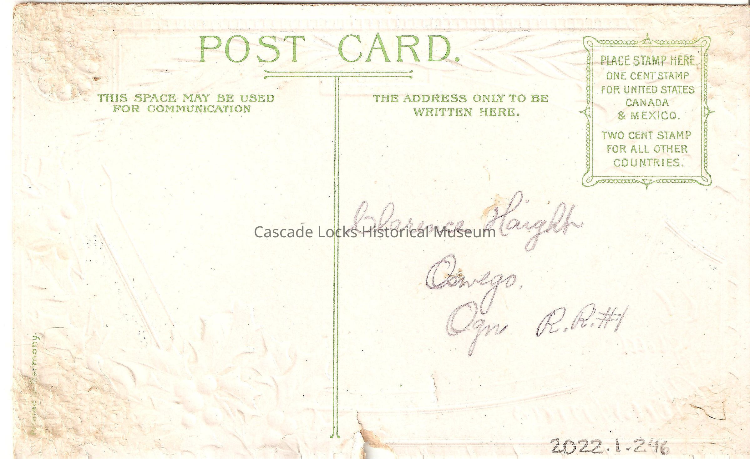 Back of image reads, "Post Card, This Space For Correspondence- Only The Address May Be Written Here- Clarence Haight, Oswego, Ore. R.R.#1. Made in Germany. Place stamp here, one cent stamp for United States, Canada and Mexico. Two cent stamp for all other Countries."Lexicon