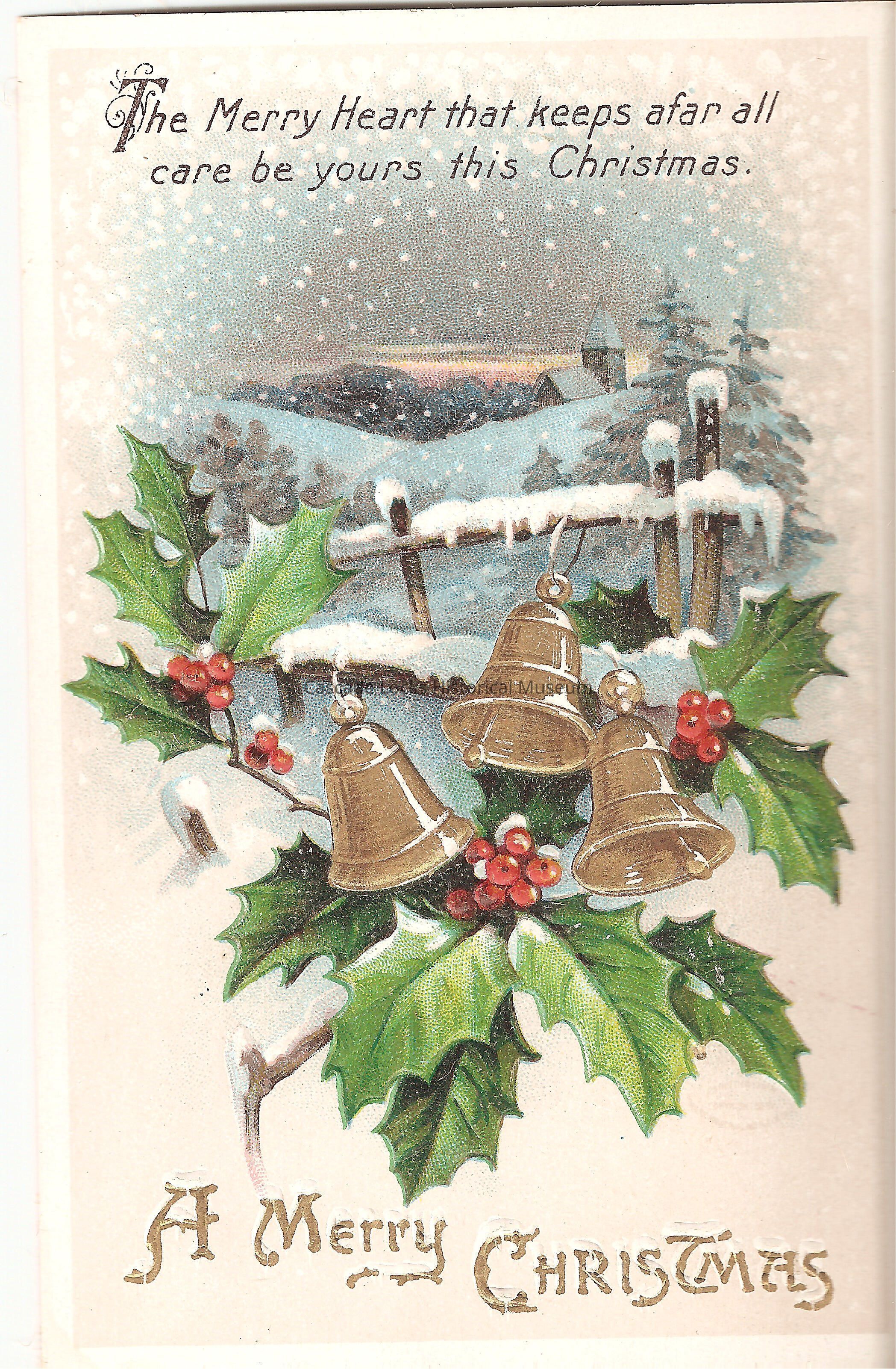 Postcard, illustrated image of a snow-scape with a church in the background. There is a fence with bells and holly. Card reads, "The Merry Heart that keeps afar all care be yours this Christmas. A Merry Christmas."