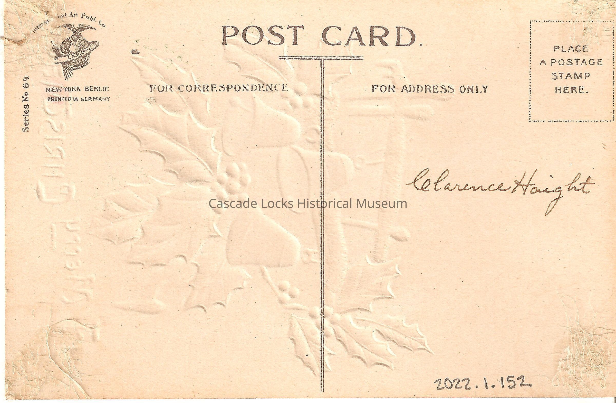 Back of image reads, "Post Card. For Correspondence. For Address Only- Clarence Haight. Place A Postage stamp Here. International Art Publ. Co. New York, Berlin. Printed in Germany. Series No. 64."Lexicon