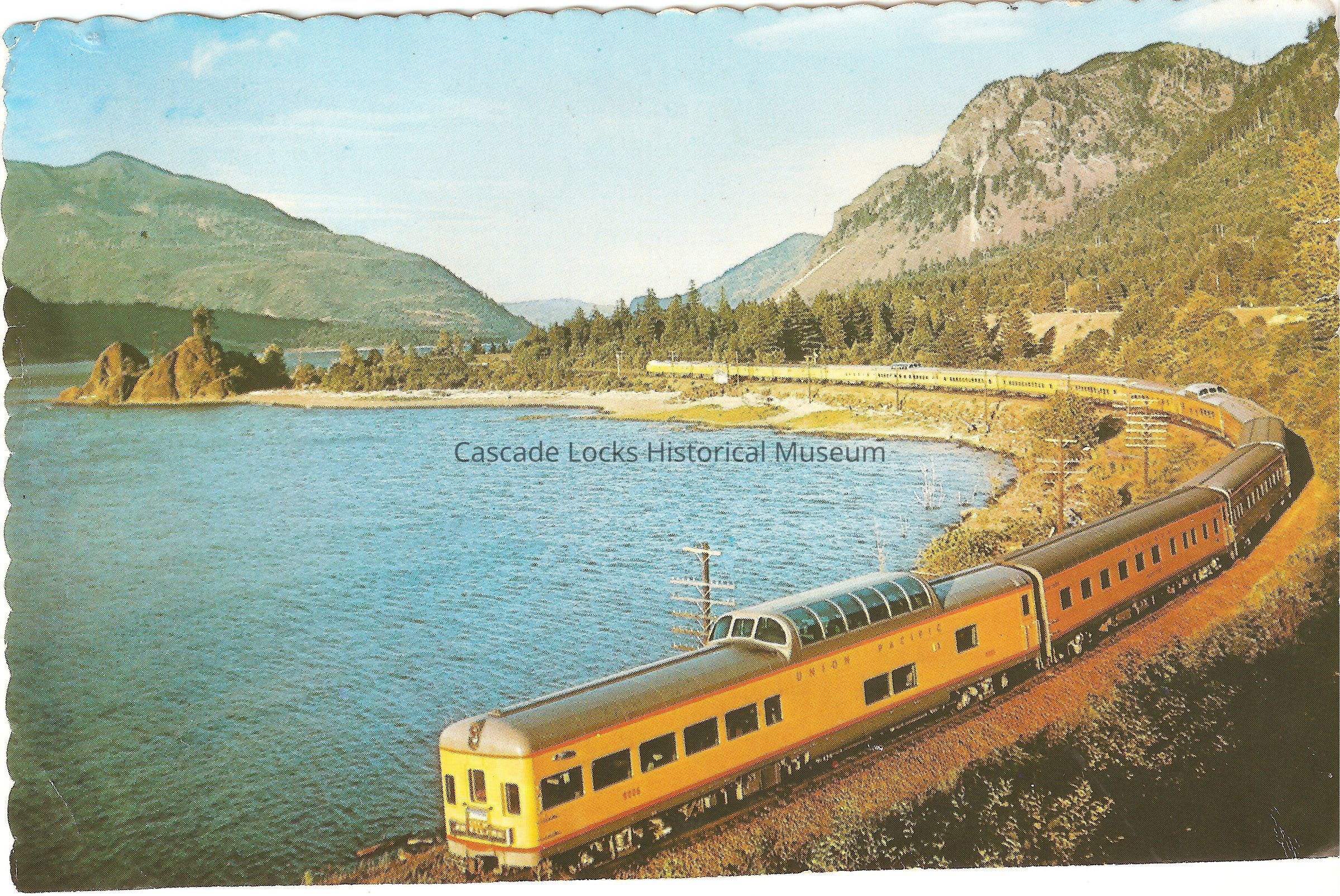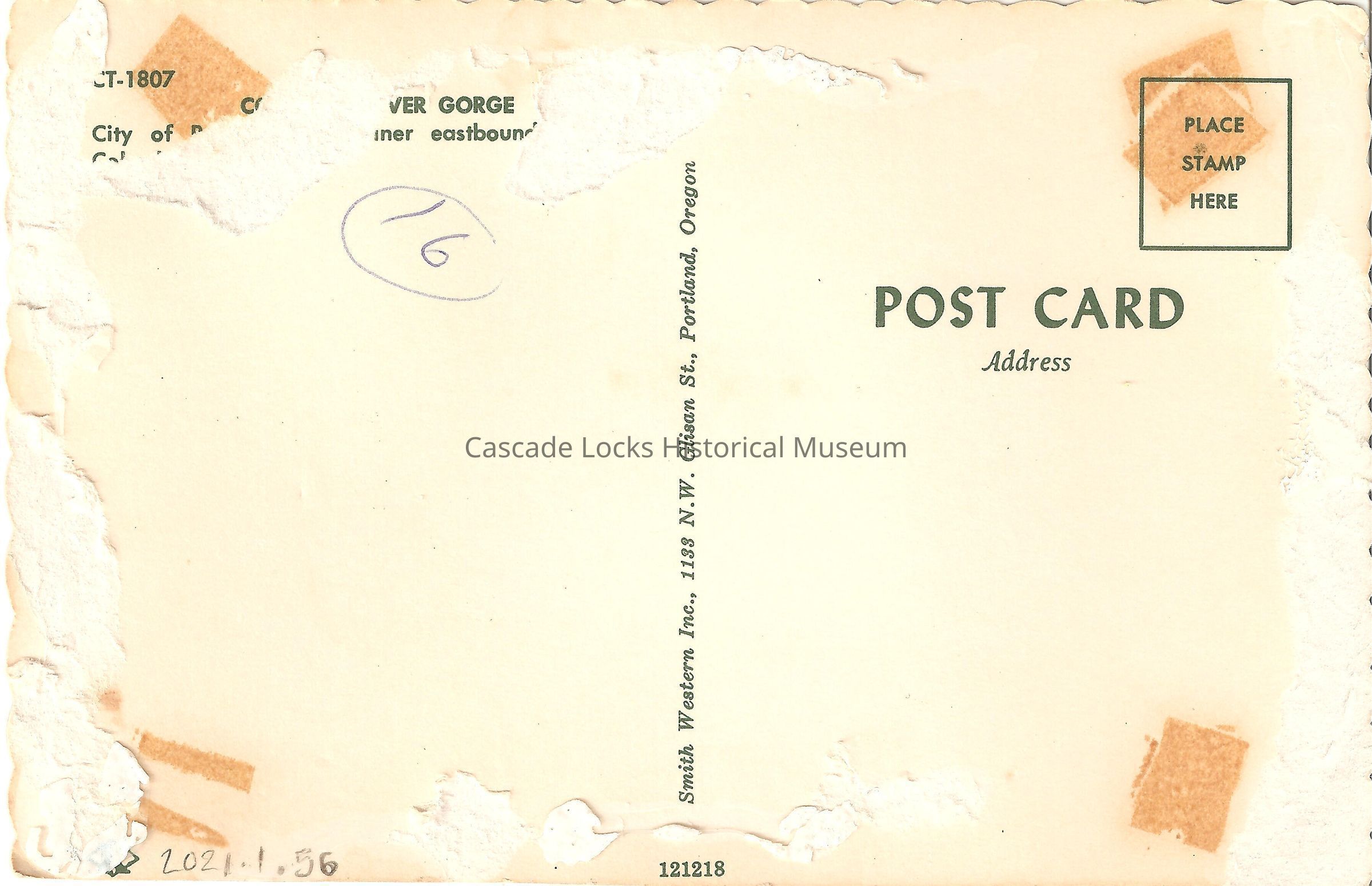 Back of image reads, "Post Card, Columbia River Gorge, City of Portland Steamliner Eastbound along the Columbia River. Ct-1807, 121218. Address. Place Stamp Here. Smith Western Inc., 1133 N.W. Glisan St., Portland, Oregon."Lexicon