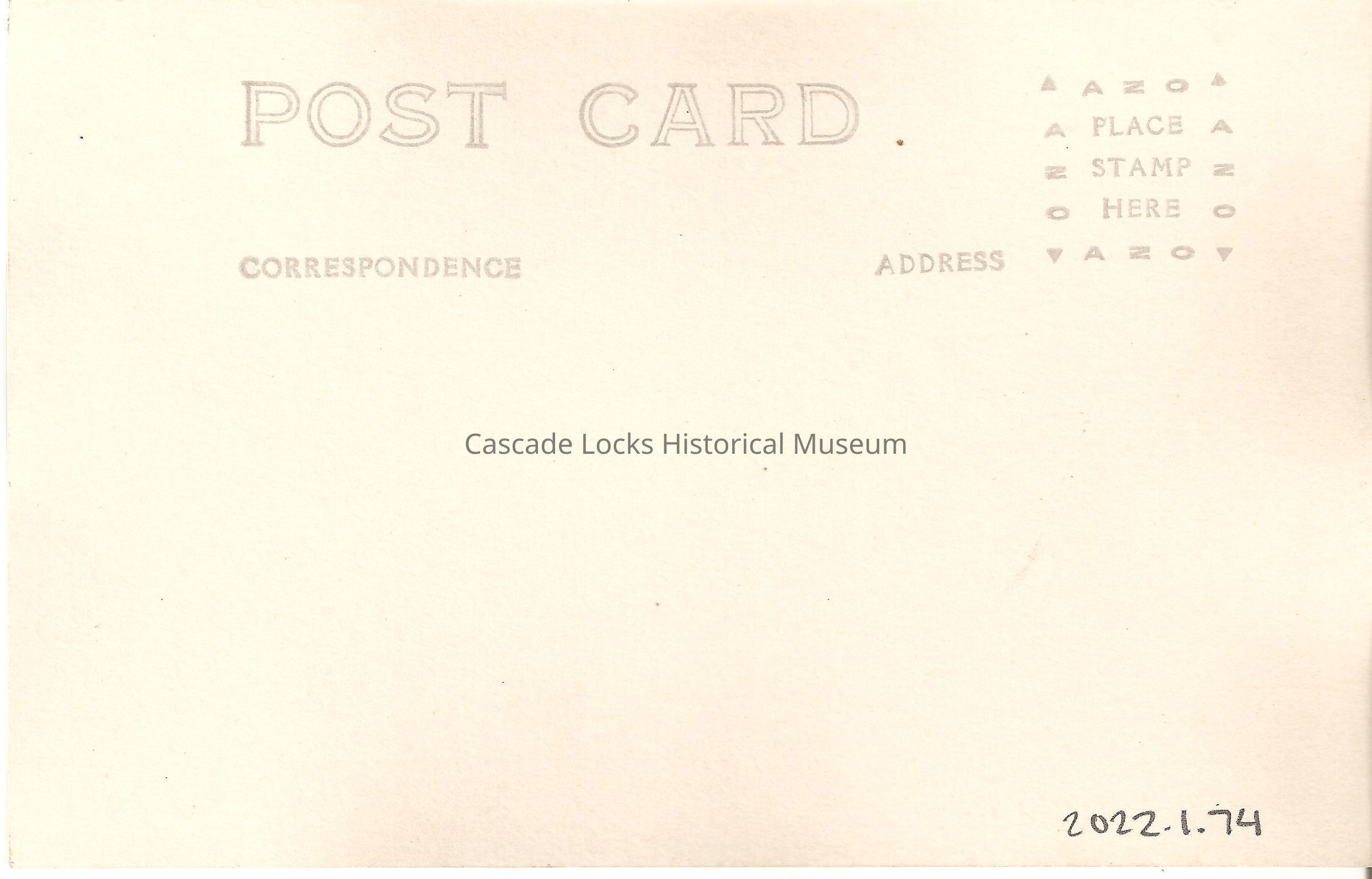Back of image reads, "Post Card. Correspondence. Address. Place Stamp Here, AZO."Lexicon