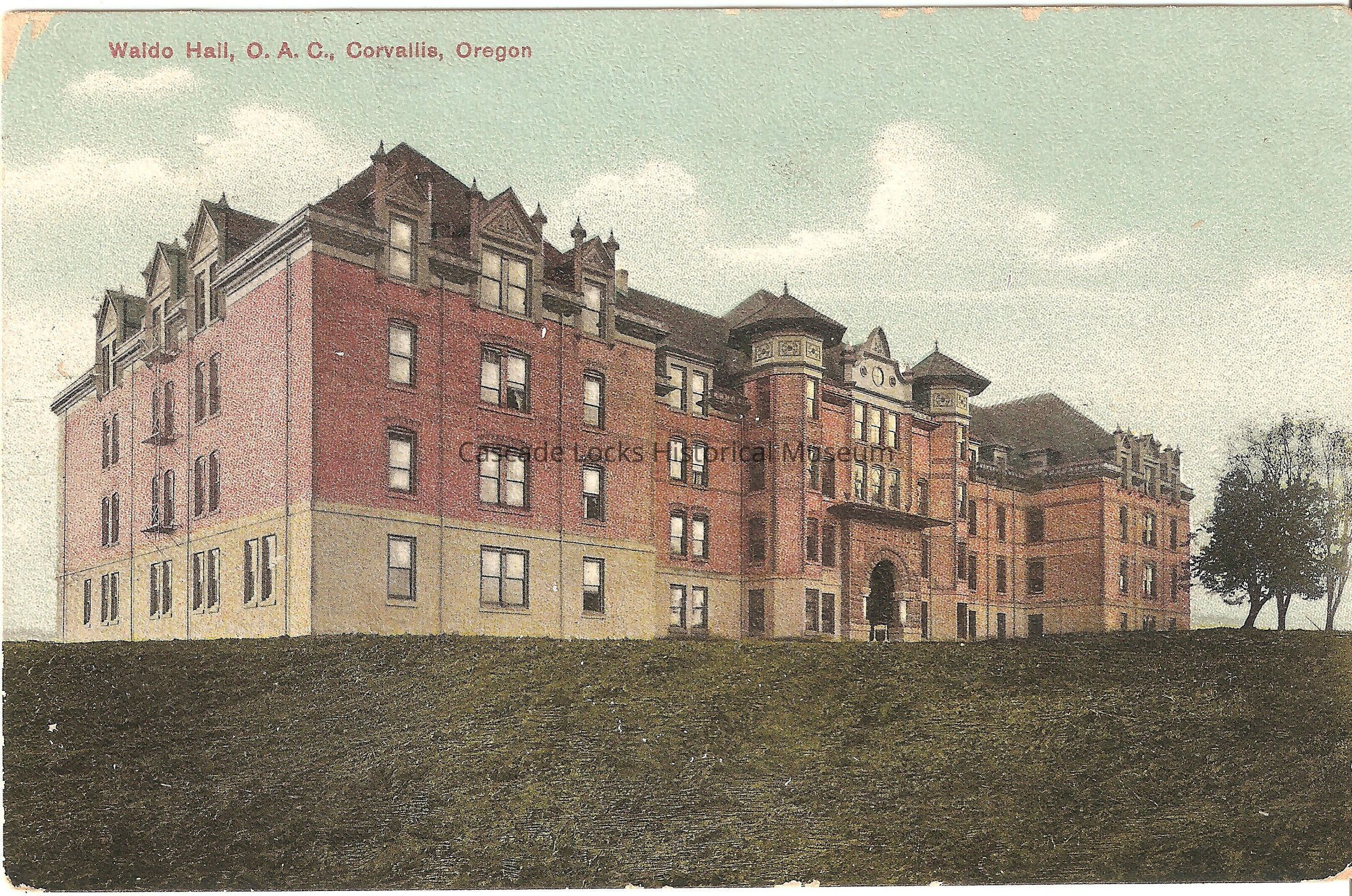 Postcard, image of Waldo Hall. Card reads, "Waldo Hall, O.A.C., Corvallis, Oregon."