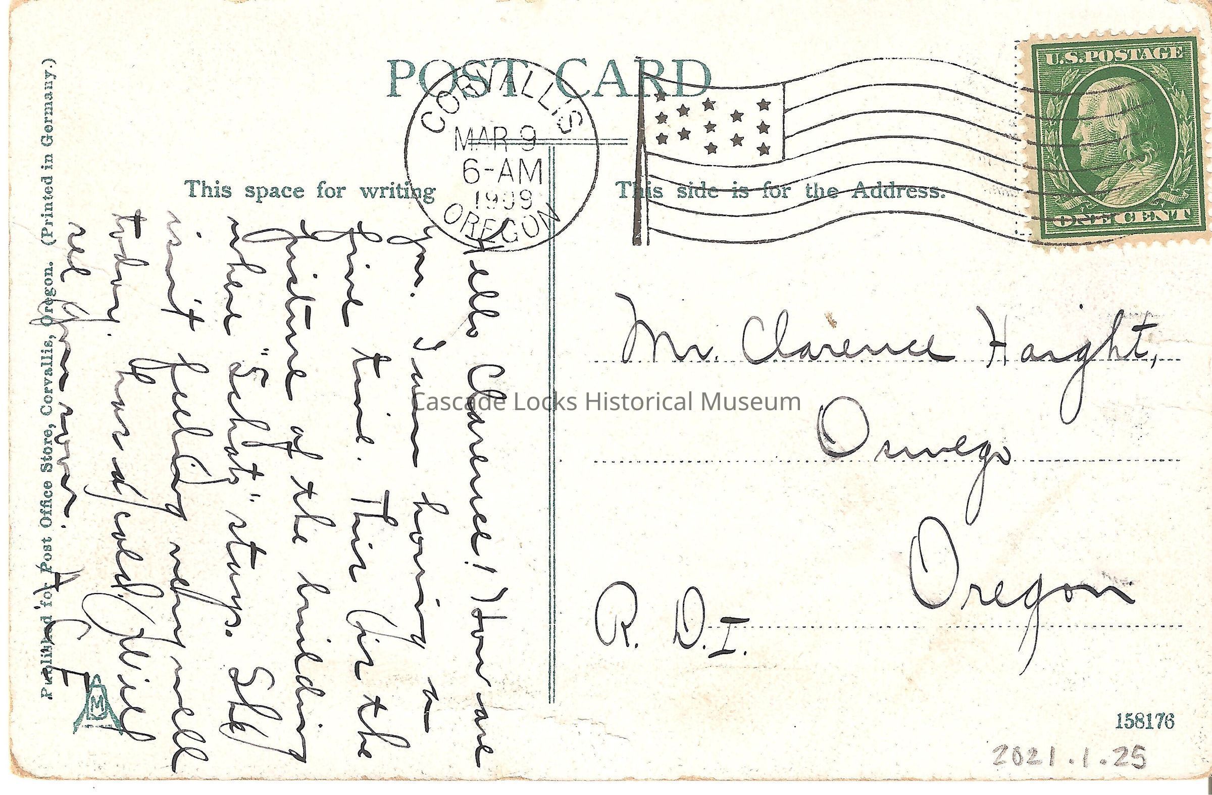 Back of image reads, "Post Card. This space for Writing- Hello Clarence! How are you. I am having a fine time. This is the picture of the building where "Schutz" stays. She isn't feeling very well today, has a cold. will see you soon, A.C.E. This side is for the Address- Mr. Clarence Haight, Oswego, Oregon. R.D.I. Published for Post Office Store, Corvallis, Oregon. Printed in Germany. Corvallis, Oregon. Mar 9, 6AM, 1909. U.S. Postage, One Cent."Lexicon