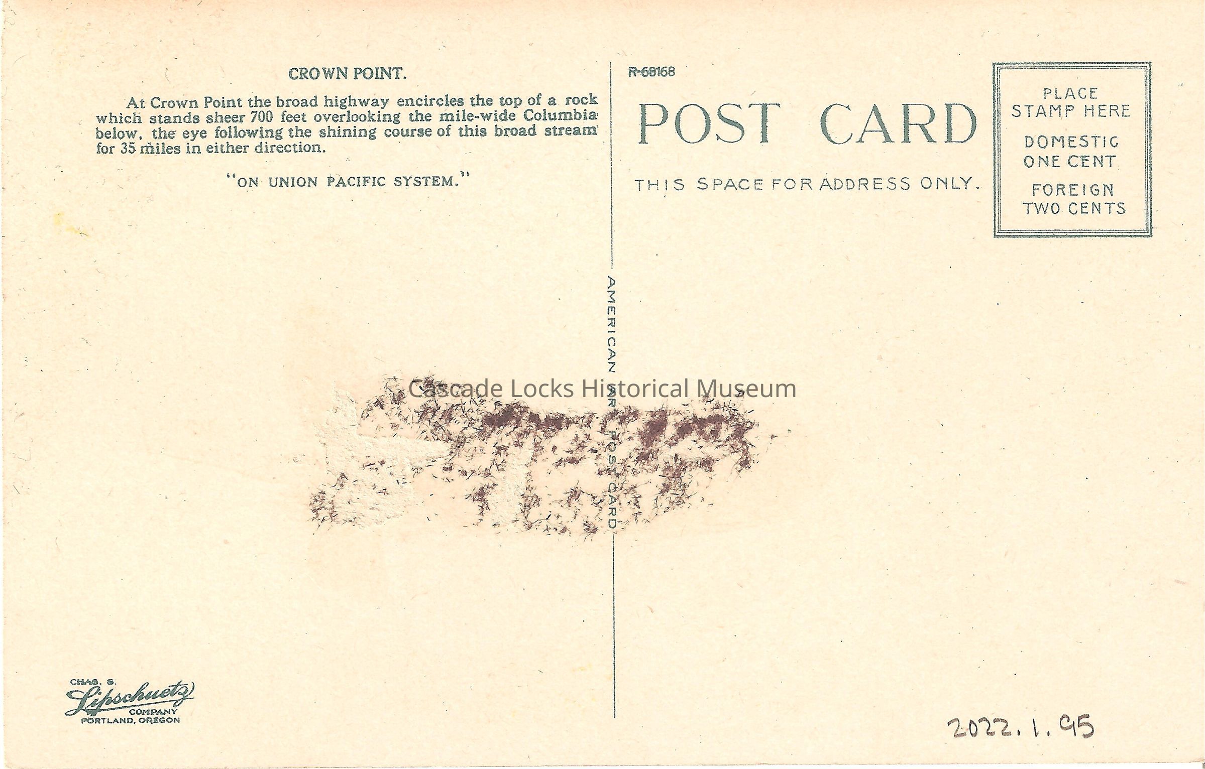 Back of image reads, "Post Card. Crown Point. At Crown Point the board highway encircles the top of a rock which stands sheer 700 feet overlooking the mile-wide Columbia below, the eye following the shining course of this board stream for 35 miles in either direction. "On Union Pacific System." This space for Address only- American Art Post Card. Chas S. Lipschuetz Company, Portland, Oregon. R-68168. Place Stamp Here, domestic One Cent, Foreign Two Cents."Lexicon