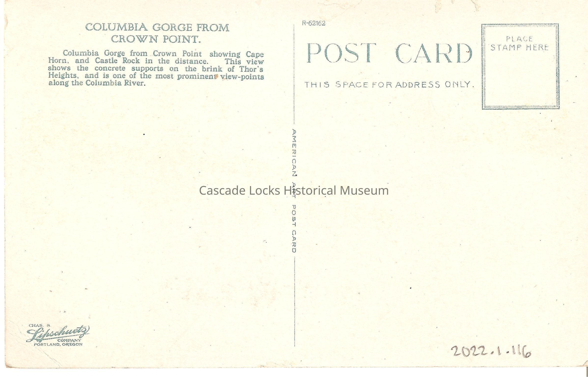 Back of image reads, "Post Card. Columbia Gorge from Crown Point, Columbia Gorge from Crown Point showing Cape Horn, and Castle Rock in the distance. This view shows the concrete supports on the bank of Thor's Heights, and is one of the most prominent view-points along the Columbia river. This Space For Address Only. Place Stamp Here. R-62162. American Art Post Card. Chas. S. Lipschuetz, Company. Portland, Oregon."Lexicon