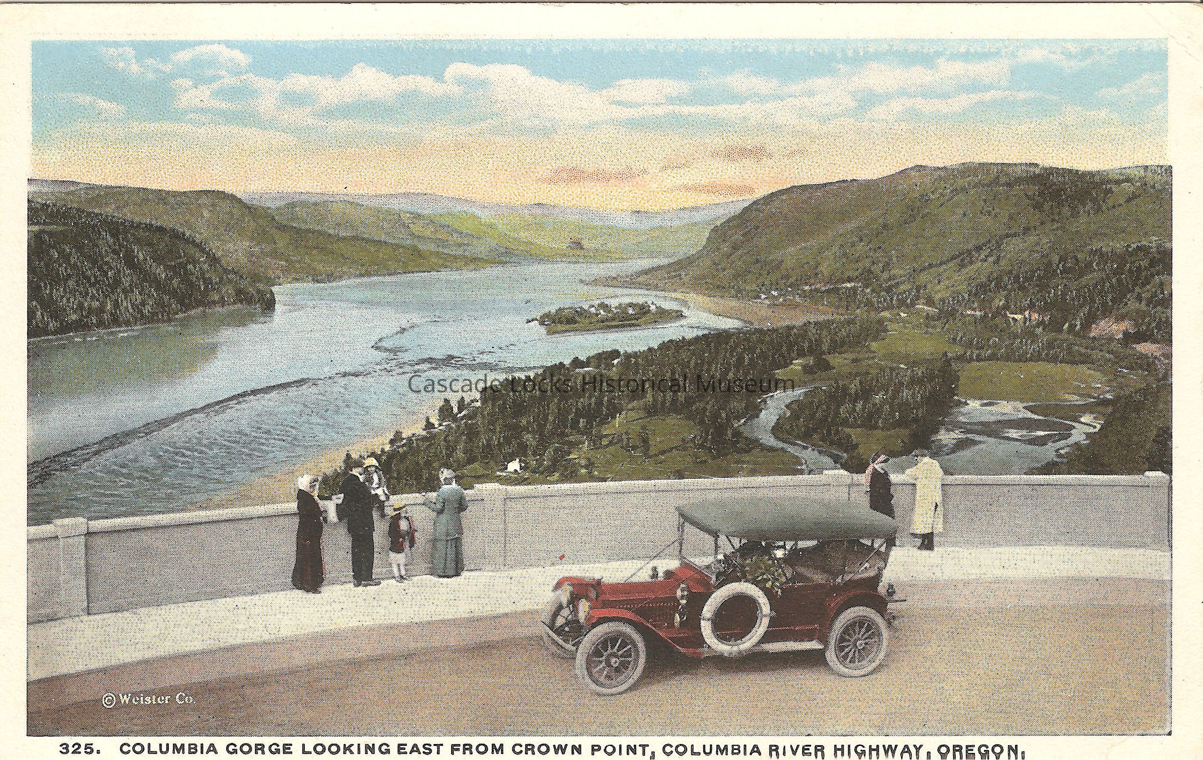 Postcard, photochrome image of Crown Point. There are people looking over the landscape and there is a car that looks similar to a Pierce Model 65 Great Arrow on the roadway. Base of image reads, "325. Columbia Gorge Looking East From Crown point, Columbia River Highway, Oregon. Weister Co."