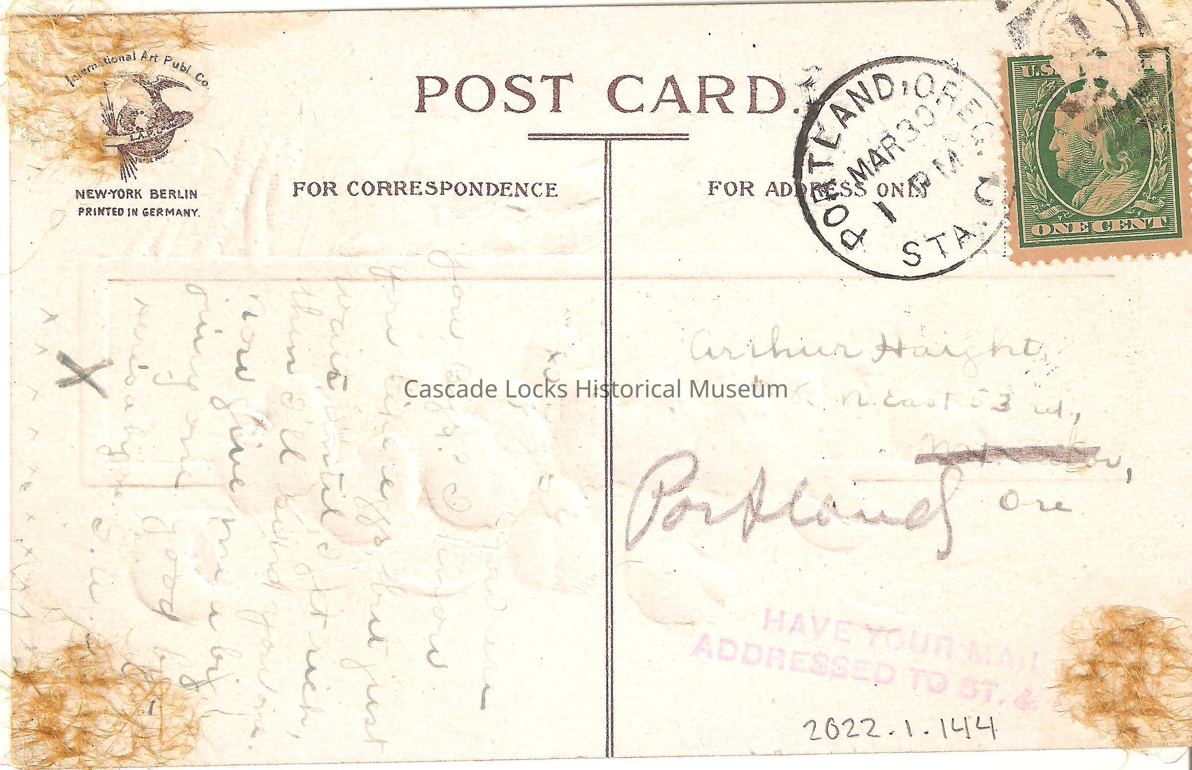 Back of image reads, "Post Card, For Correspondence- Boys, how are you boys? I know you like eggs, but just wait until I get rich, then I'll send you one. Now give me a big juicy one good-bye, here's a big one. S.A.C. XXXXXXXXXXX. For Address Only- Arthur Haight, 18 N East 53rd, Portland, Ore. Portland, Ore, STA. C. Mar 30, 1Pm. Have your mail Addresses to St & (?) (Stamp). U.S. Postage, One Cent. International Art Publ. Co. New York, Berlin. Printed in Germany."Lexicon