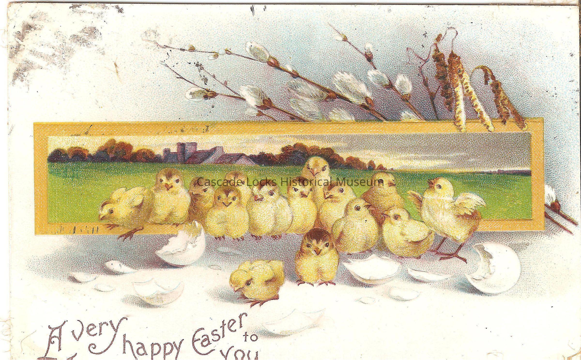 Postcard, illustrated image of 15 chicks surrounded by broken egg shells. Behind them is a landscape image. Card reads, "A Very Happy Easter to You."
