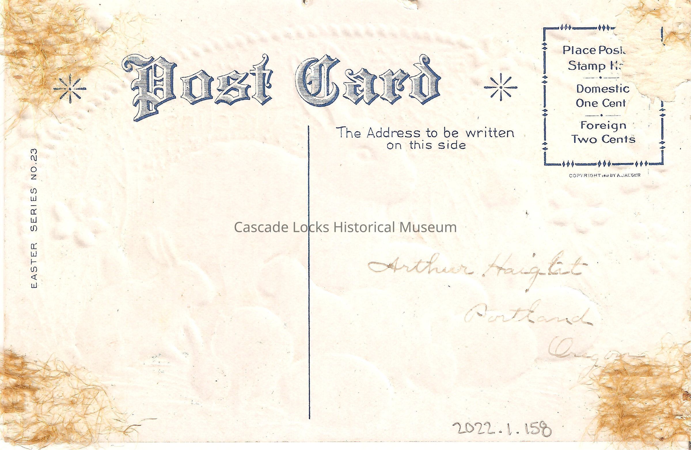Back of image reads, "Post Card. The Address to be written on this side- Arthur Haight, Portland, Ore. Place Postage Stamp Here, Domestic one Cent, Foreign Two Cents. Easter series No. 23. Copyright 1910 by A. Jaeger."Lexicon