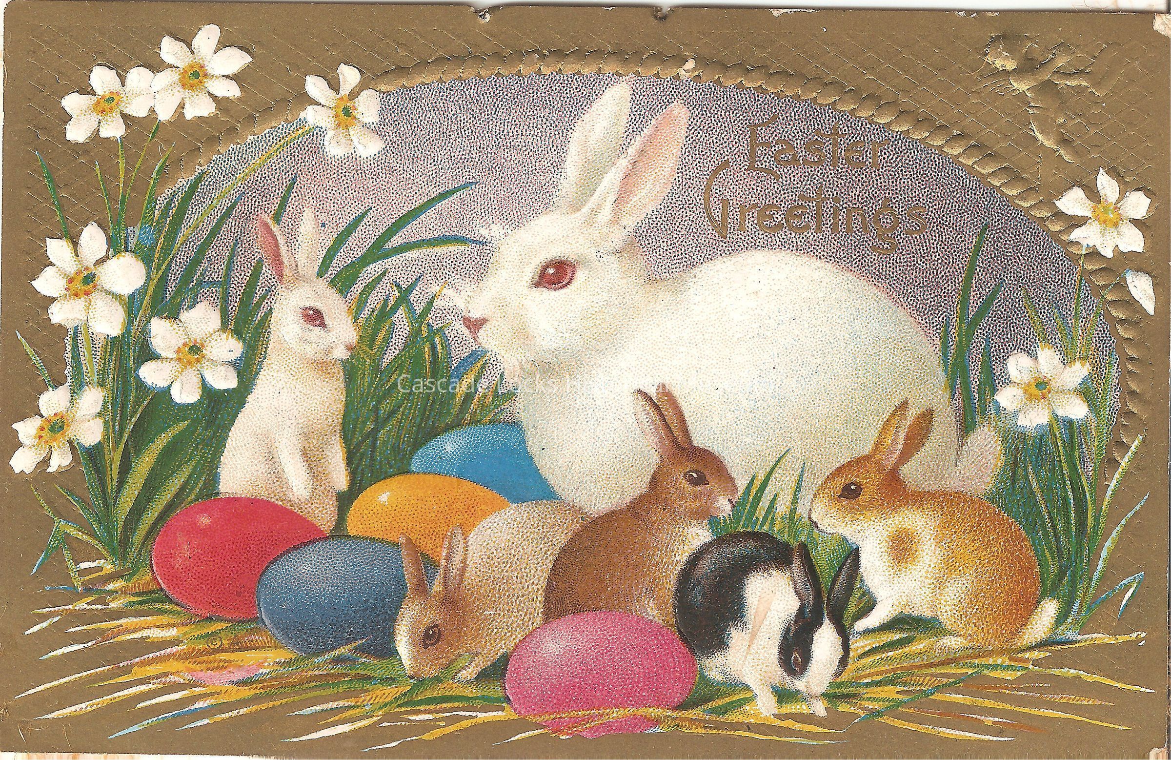 Postcard, illustrated image of six bunnies in varying colors surrounded by easter eggs. Card has a gold boarder with white flowers. The card reads. "Easter Greetings."