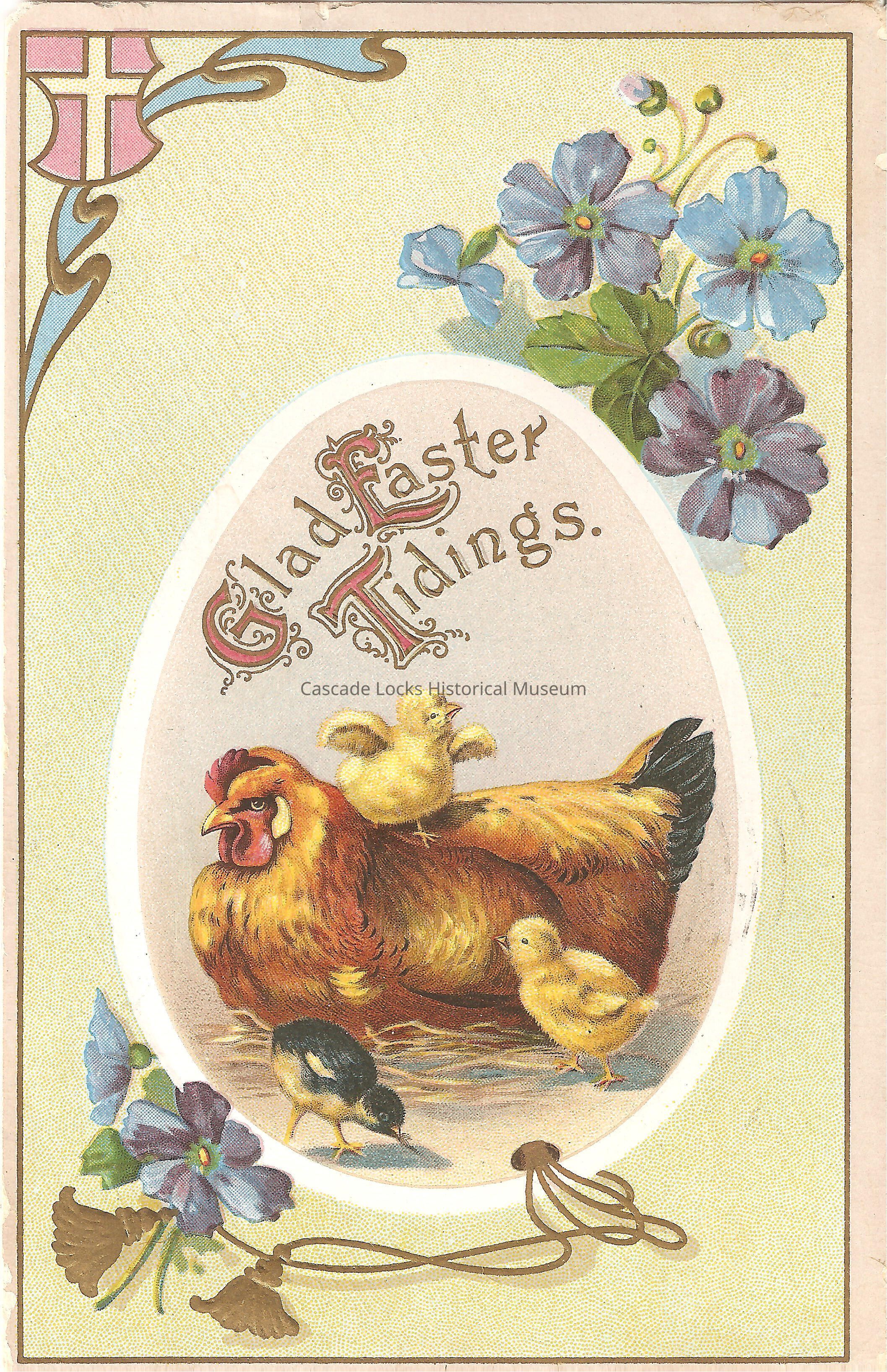 Postcard, illustrated image of three chicks, one is siting on top of a chicken. The boarder is green with blue flowers. The card reads, "Glad Easter Tiding. Copyright 1910, H. Wessler."
