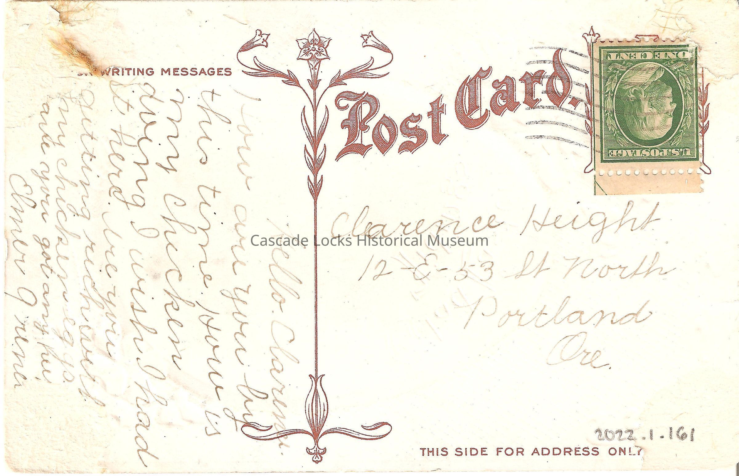 Back of image reads, "Post Card. For Writing Messages- Hello Clarence, how are you, by this time how is my chicken doing? I wish I had it here. Are you getting rich with my chicken eggs? (?) are you got any (?), -Elmer g. (?). This Side For Address Only- Clarence Haight, 12 E 53 St North. Portland, Oregon. U.S. Postage, One Cent."Lexicon