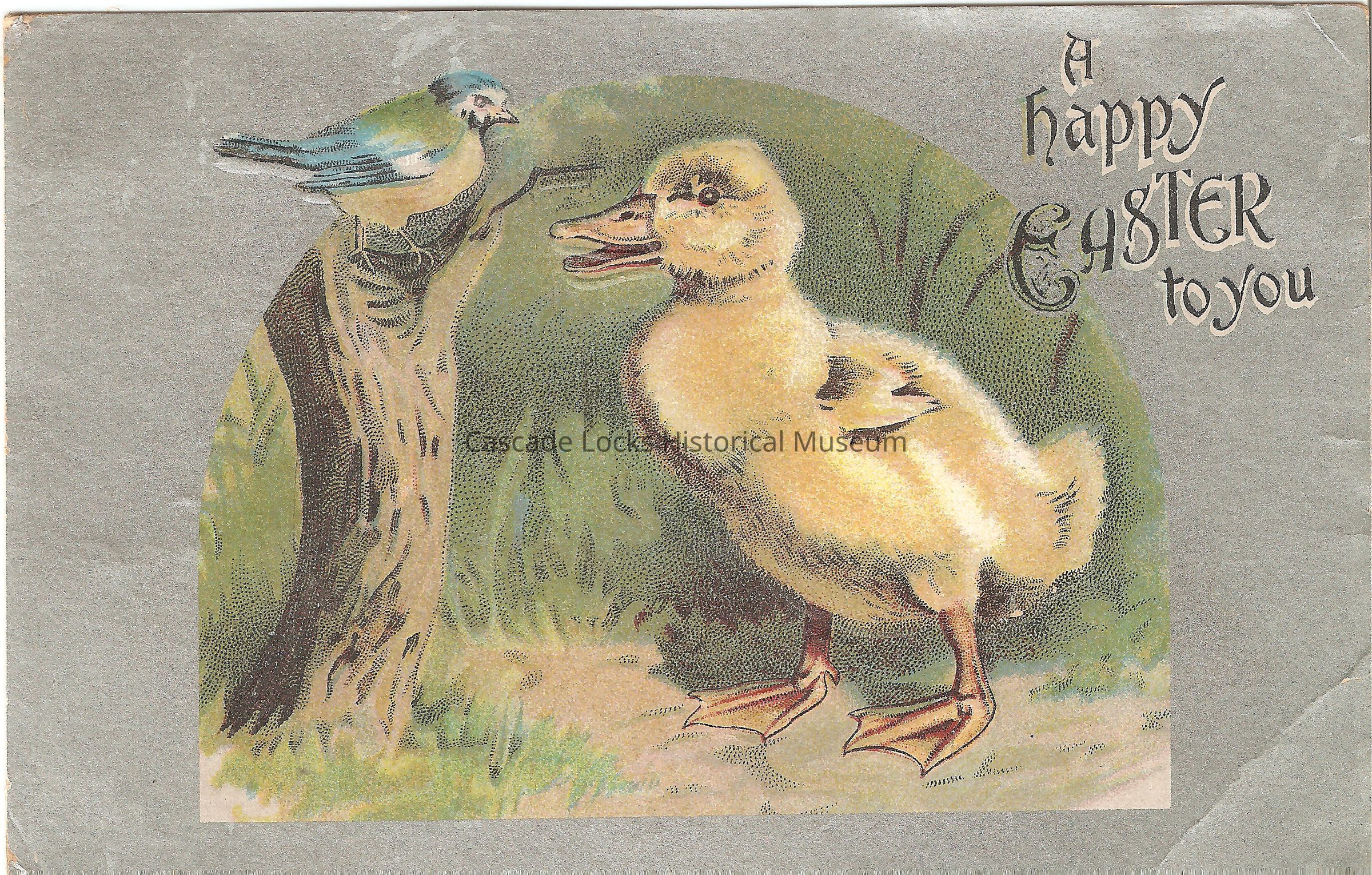 Postcard, illustrated image of a chick and a blue bird interacting. The upper right corner of the image reads, "A Happy Easter to you."