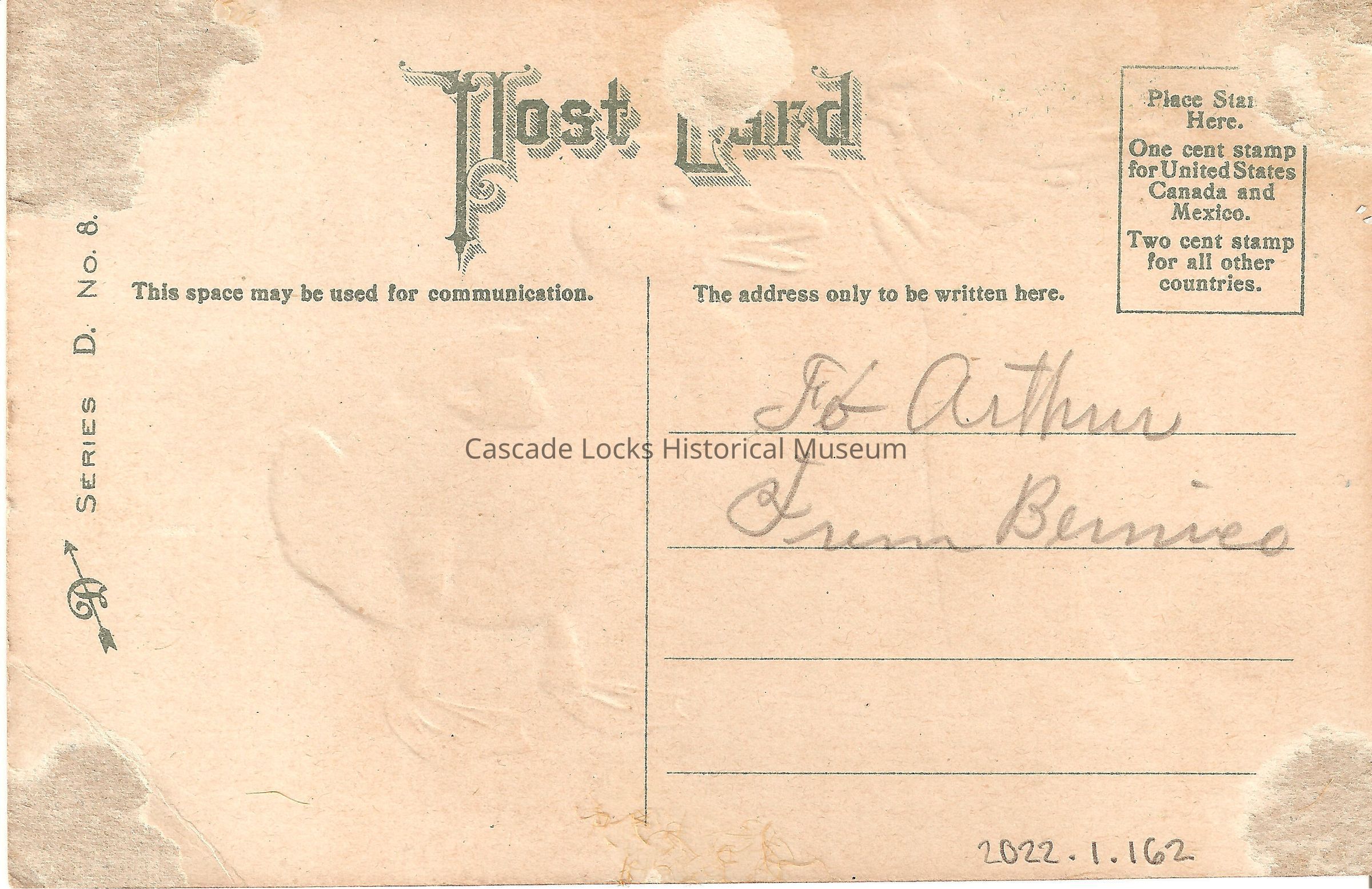 Back of image reads, "Post Card. This space may be used for communication- The address only to be written here- To Arthur From Bernice. Place Stamp Here, One cent stamp for United States, Canada, and Mexico. Two cent stamp for all other countries. D, Series D. No. 8."Lexicon