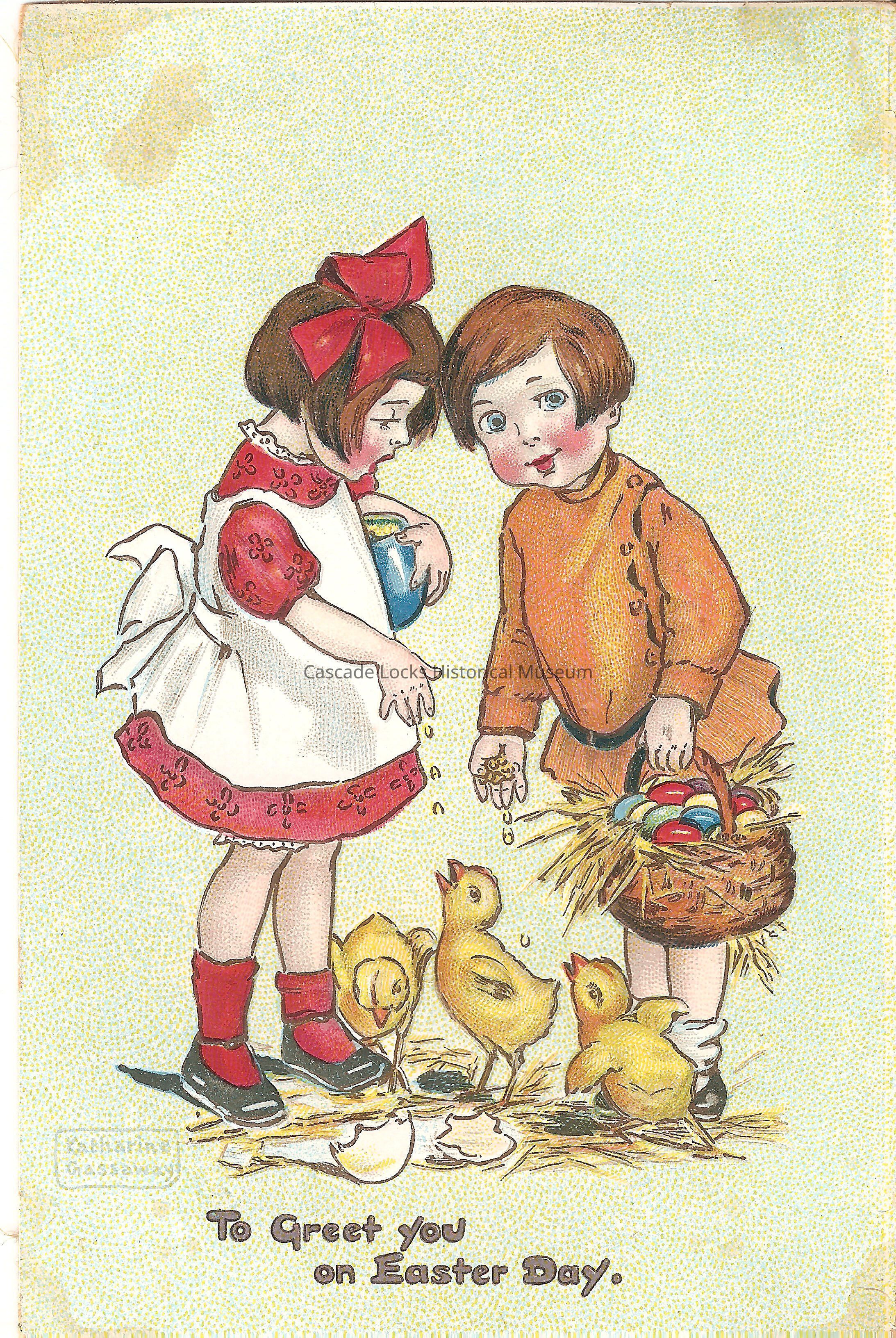 Postcard, illustrated image of two children feeding chickens corn seed. One child is holding a basket of colored Easter eggs. Base of card reads, "To Greet you on Easter Day. Katharine Gassaway."