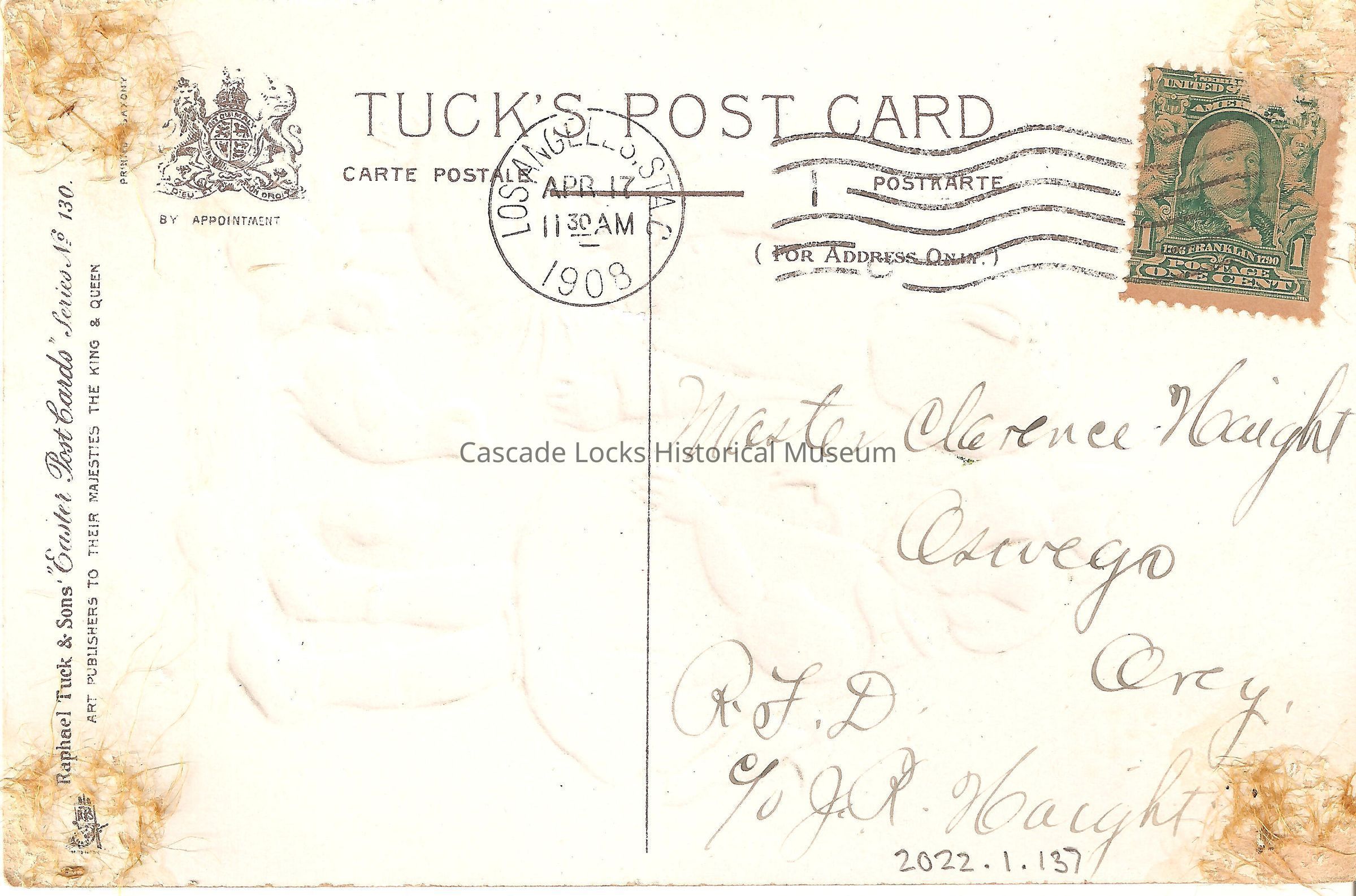 Back of image reads, "Tucks Post Card. Raphael Tuck & Sons' "Easter Post Cards" Series No. 130. Art Publishers to their Majesties the King and Queen, Printed in Saxony (Germany). By Appointment. Carte Postalei. Postkarte, For Address Only. Master Clarence Haight, Oswego, Ore. R.F.D. c/o J. R. Haight. Los Angeles STA C. Apr 17, 1130AM, 1908. United States of America 1706-1790 Franklin, Postage One Cent (Stamp)."Lexicon