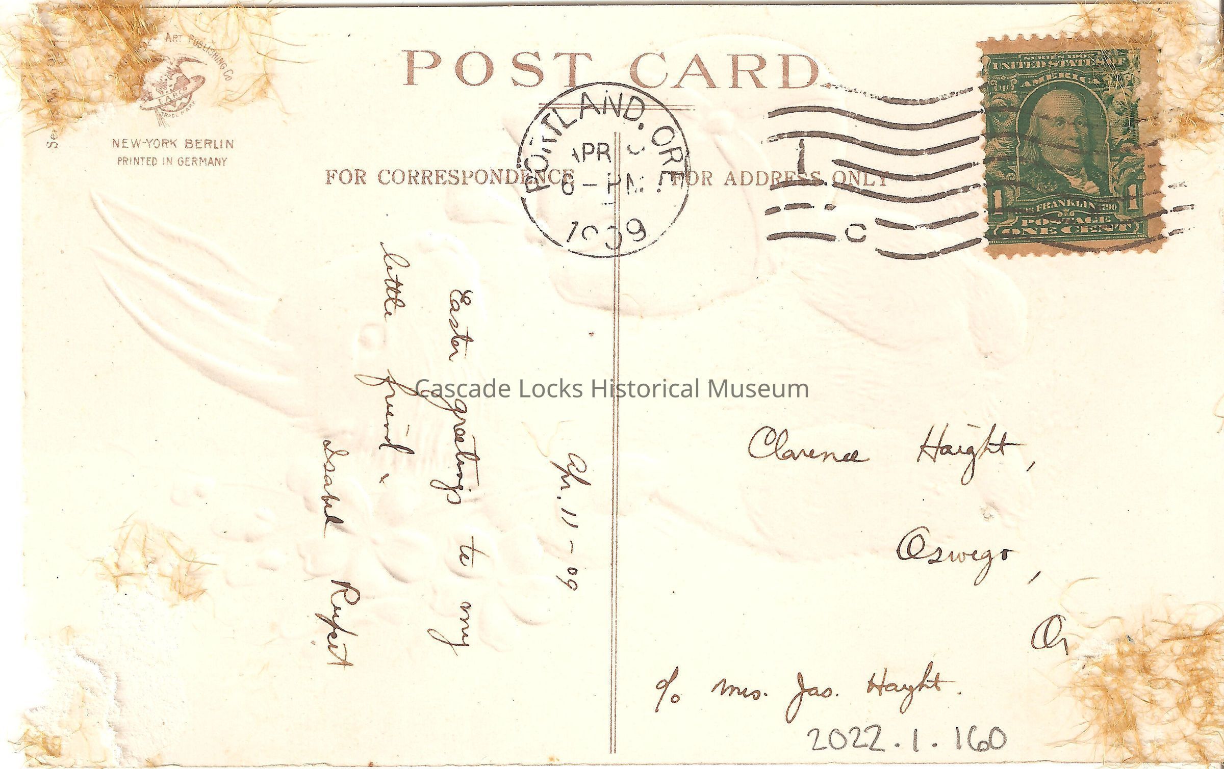 Back of image reads, "Post Card. For Correspondence- Apr 11, (19)09, Easter Greetings to my little friend, (?) Rupert. For Address Only- Clarence Haight, Oswego, Or. c/o Mrs. Jas. Haight. Portland, ORE. Apr, 6PM, 1909. United States of America 1706-1790 Franklin, Postage One Cent (Stamp). International Art Publishing Co. New York, Berlin. Printed in Germany. Series No. 994."Lexicon