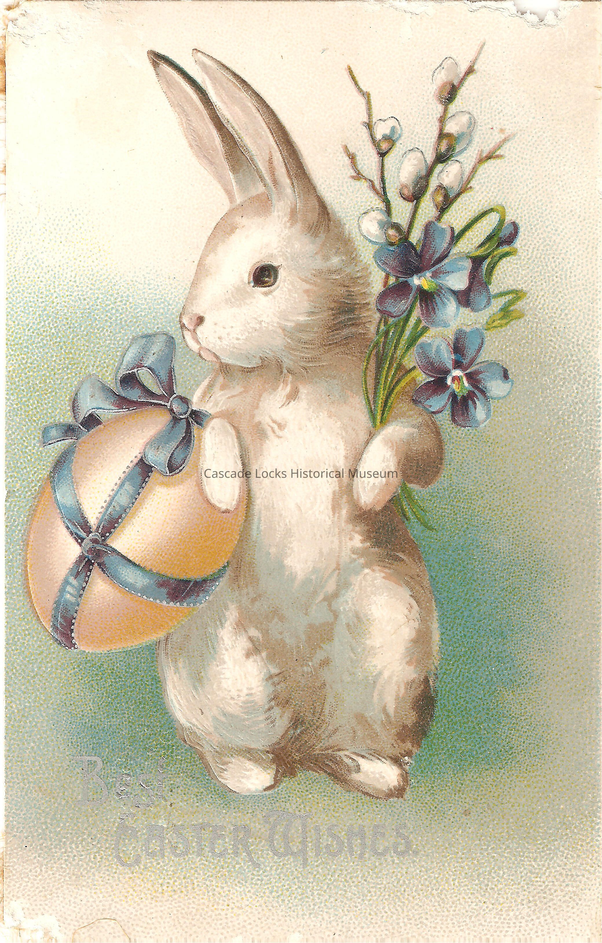 Postcard, illustrated image of a white bunny holding an egg wrapped in ribbon in one hand and a bouquet of flowers in the other hand. The base of the image reads, "Best Easter Wishes."