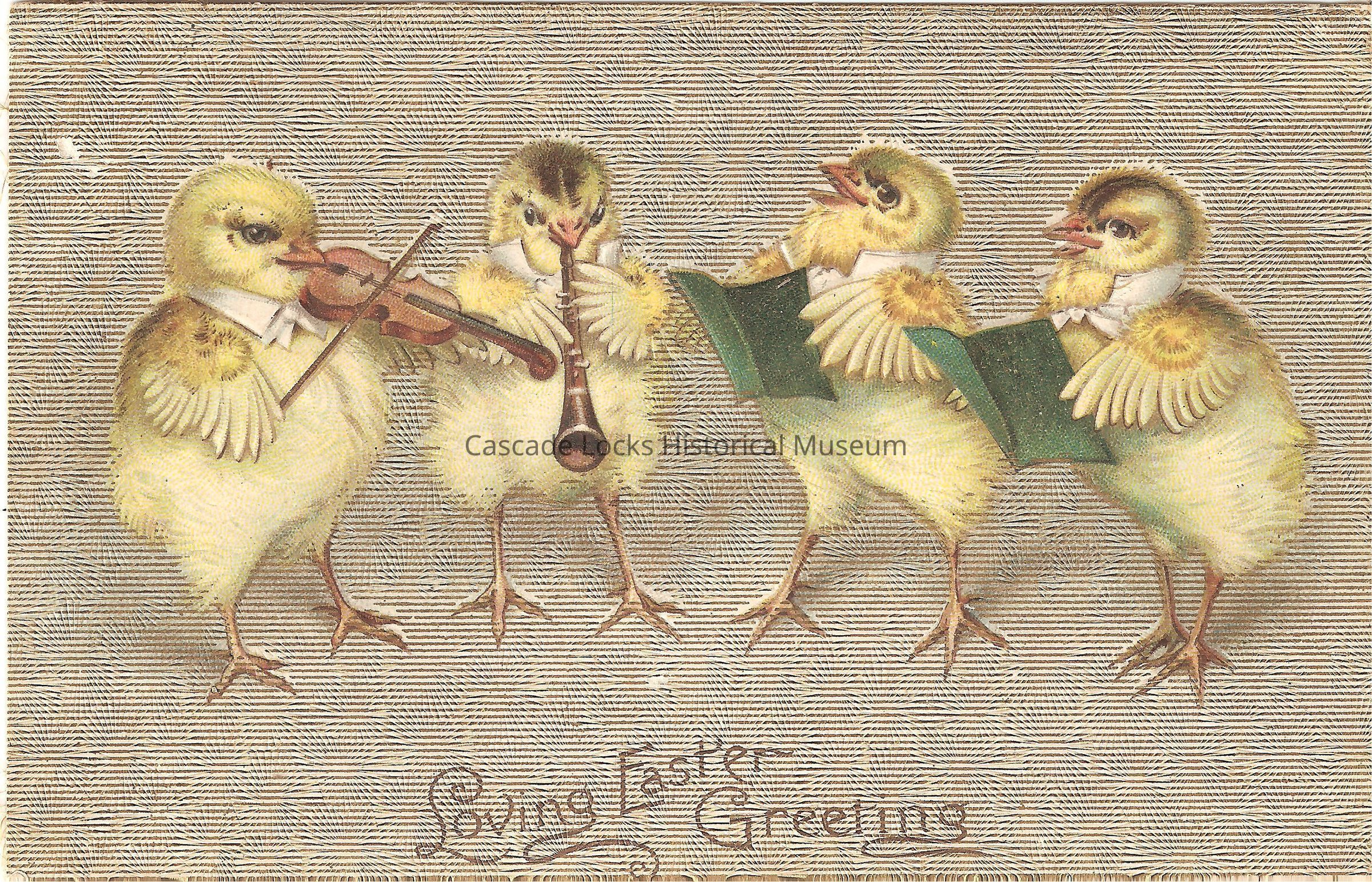 Postcard, illustrated image of four chicks playing in a band. Card reads, "Loving Easter Greetings."