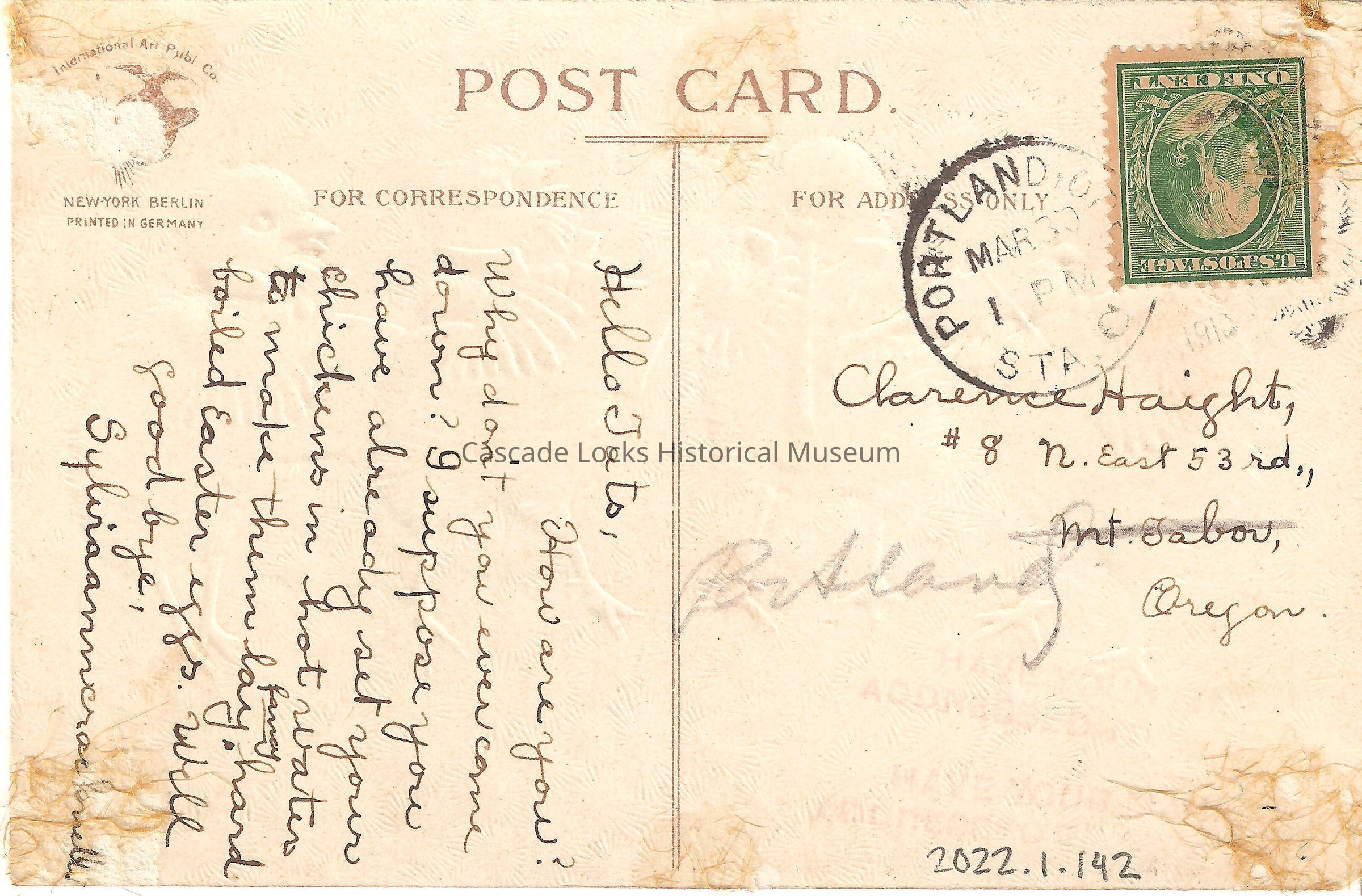 Back of image reads, "Post Card, For Correspondence- Hello Lats, How are you? Why don't you ever come down? I suppose you have already set your chickens in hot water to make them lay hard boiled eggs. Well good-bye, Syliraanncrea Lovell. For Address Only- Clarence Haight, #8 East 53 St, Portland, Oregon. Portland, Ore, STA. C. Marc 30, 1PM, 1910. U.S. Postage, One Cent. International Art Publ. Co. New York, Berlin. Printed in Germany."Lexicon