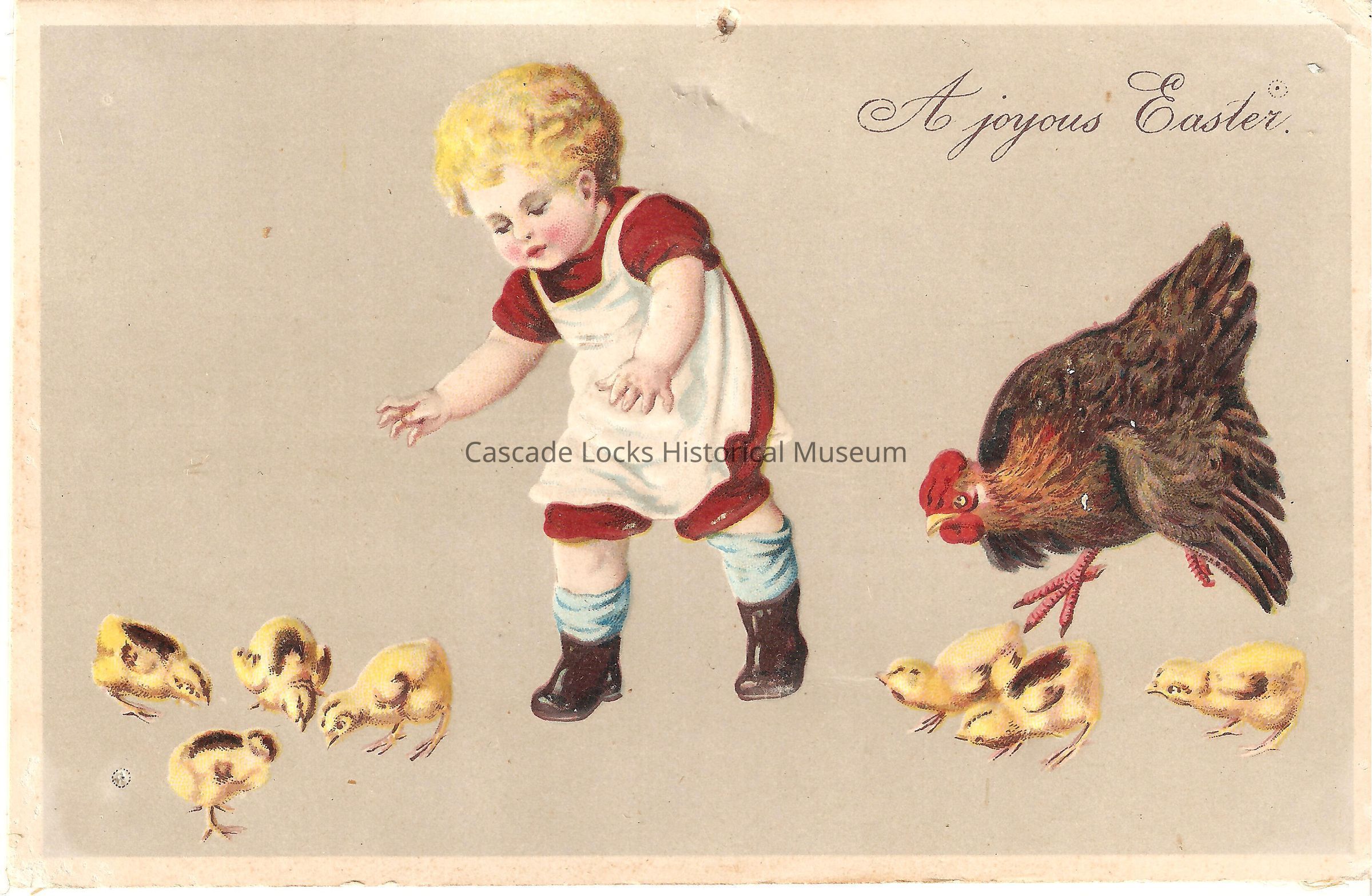 Postcard, illustrated image of 7 chicks, a chicken, and a young child trying to pick them up. Card reads, "A joyous Easter."