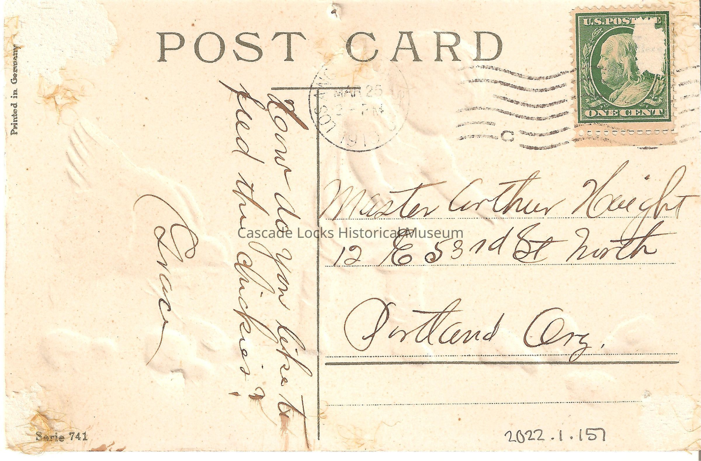 Back of image reads, "Post Card. How do you like to feed the chickies? -Grace. Master Arthur Haight, 12 E. 53rd St North, Portland, Org. Printed in Garmany. Series 741. U.S. Postage, One Cent. Los Angeles STA C. Mar 25, 2PM, 1910."Lexicon