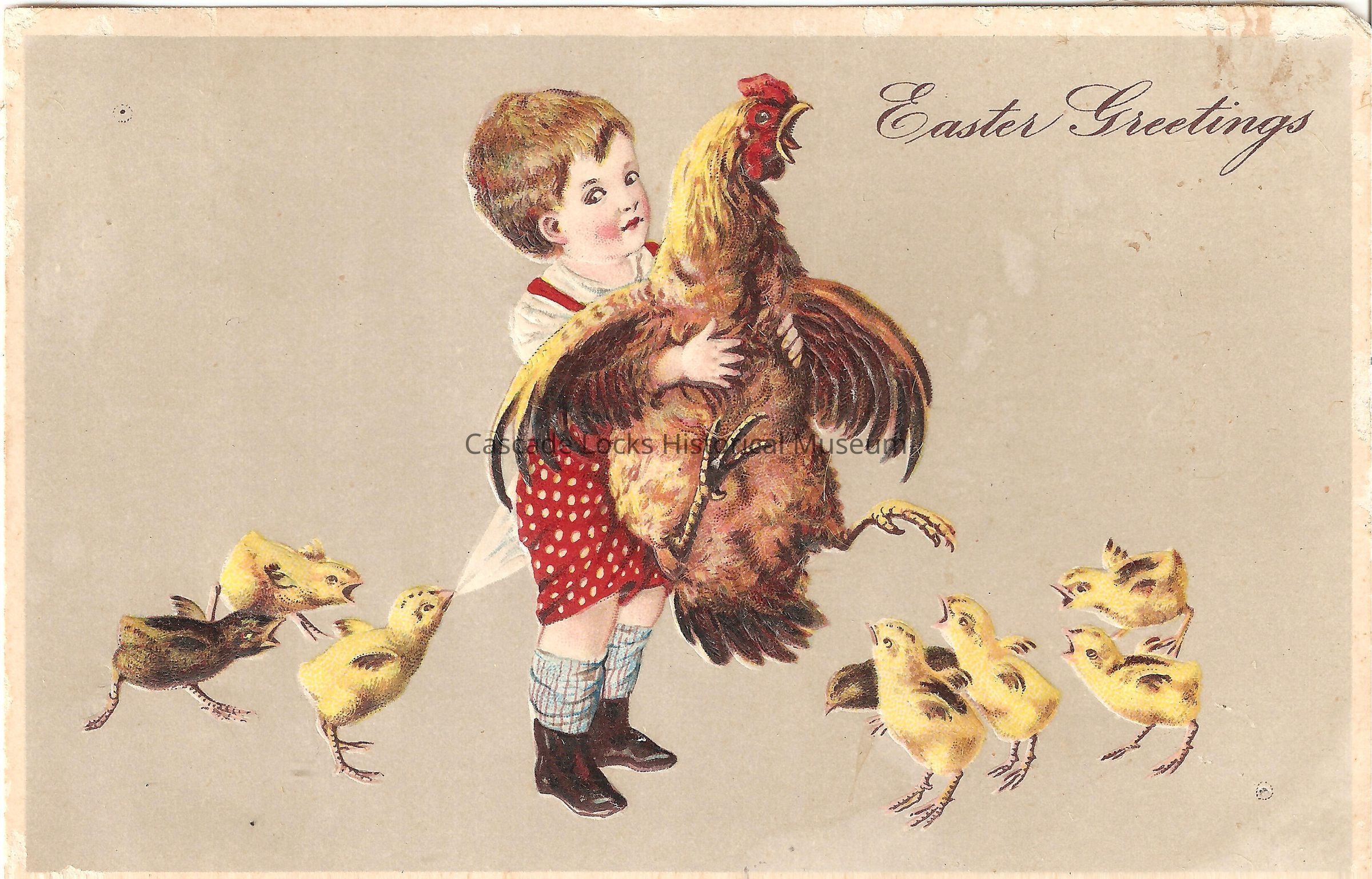 Postcard, illustrated image of a young child holding a disgruntled looking chicken while chicks squawk and tug at his clothing. The upper right of the card reads, "Easter Greetings."