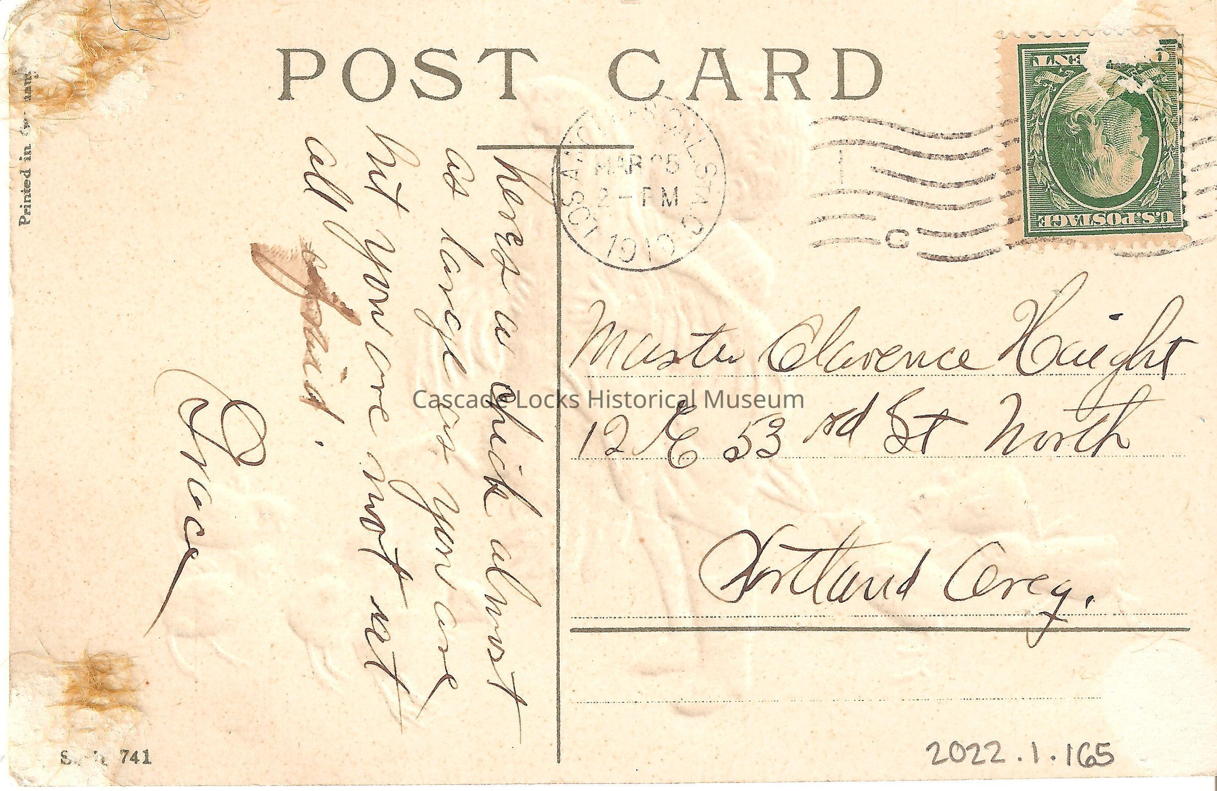 Back of image reads, "Post Card. Here's a chick almost as large as you are but you are not at all afraid- Grace. Master Clarence Haight 12 E. 53 St North, Portland, Oreg. U.S. Postage, One Cent. Los Angeles STA C. Mar 25, 2PM, 1910. Printed in Germany. Series 741.Lexicon