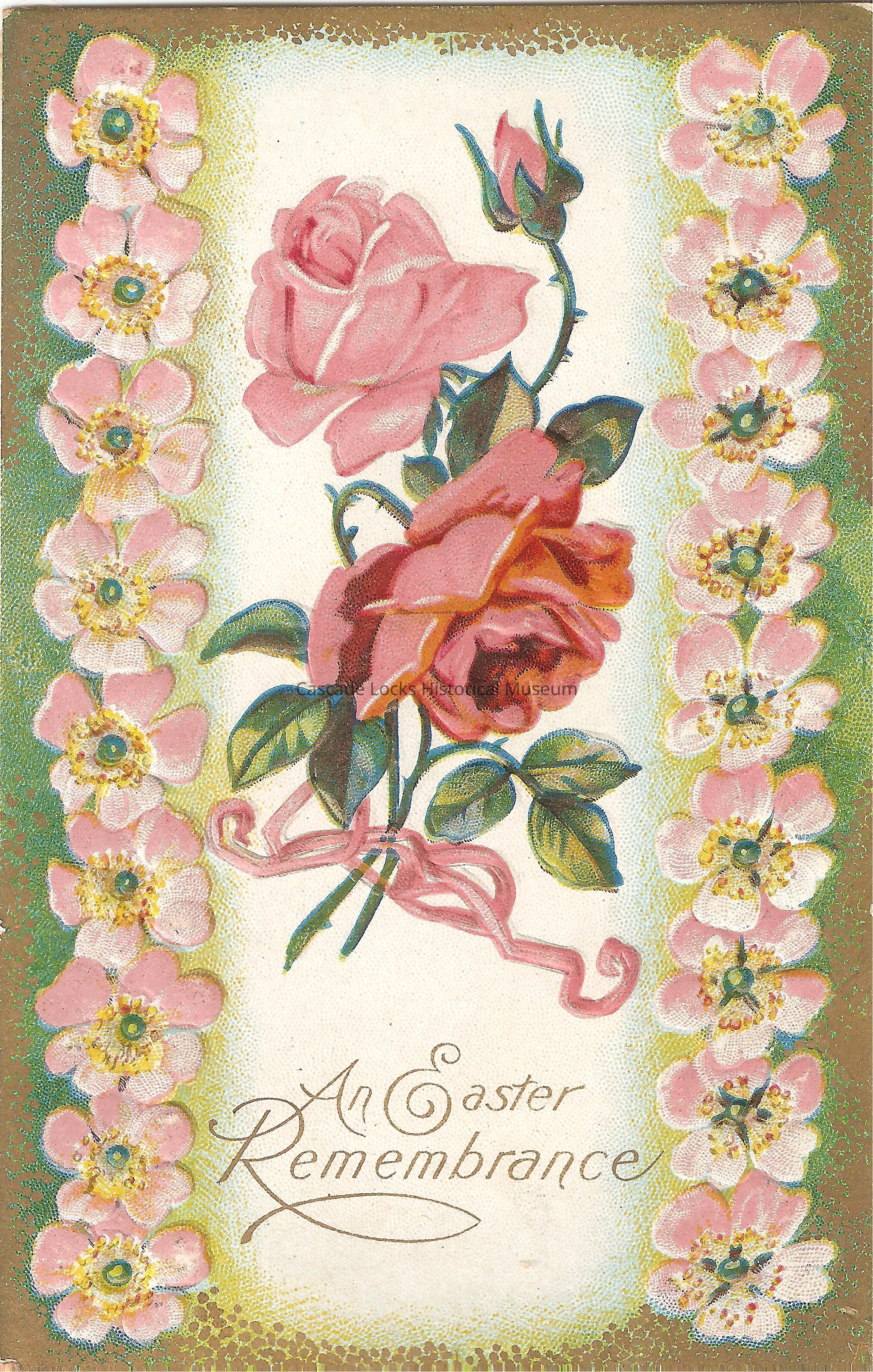 Postcard, illustrated image of pink roses surrounded by a boarder of pink flowers. The base of the image reads, "An Easter Remembrance."