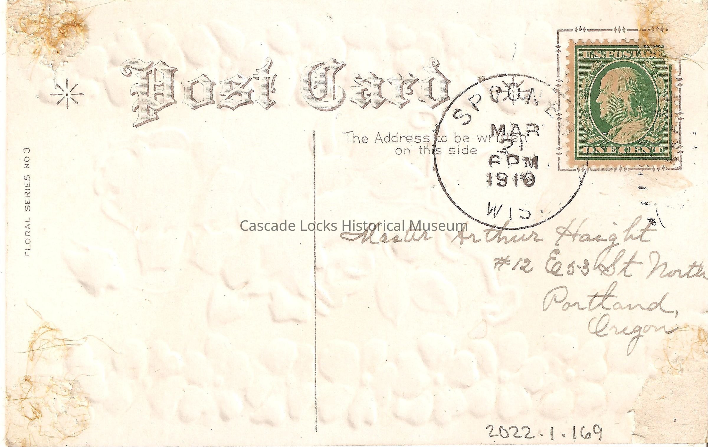 Back of image reads, "Post Card. The Address to be written on this side. Master Arthur Haight, 12 E. 53 St North, Portland, Oregon. Spoone, Wis. Mar 21, 6PM, 1910. Floral Series No. 3. U.S. Postage, One Cent."Lexicon