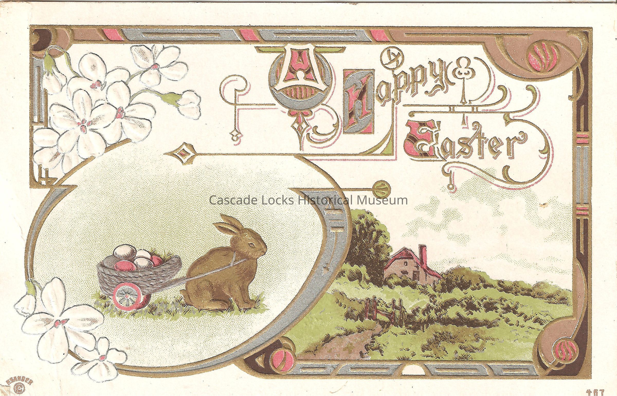 Postcard, illustrated image of a landscape and bunny pulling a cart of easter eggs. Card reads, "A Happy Easter."