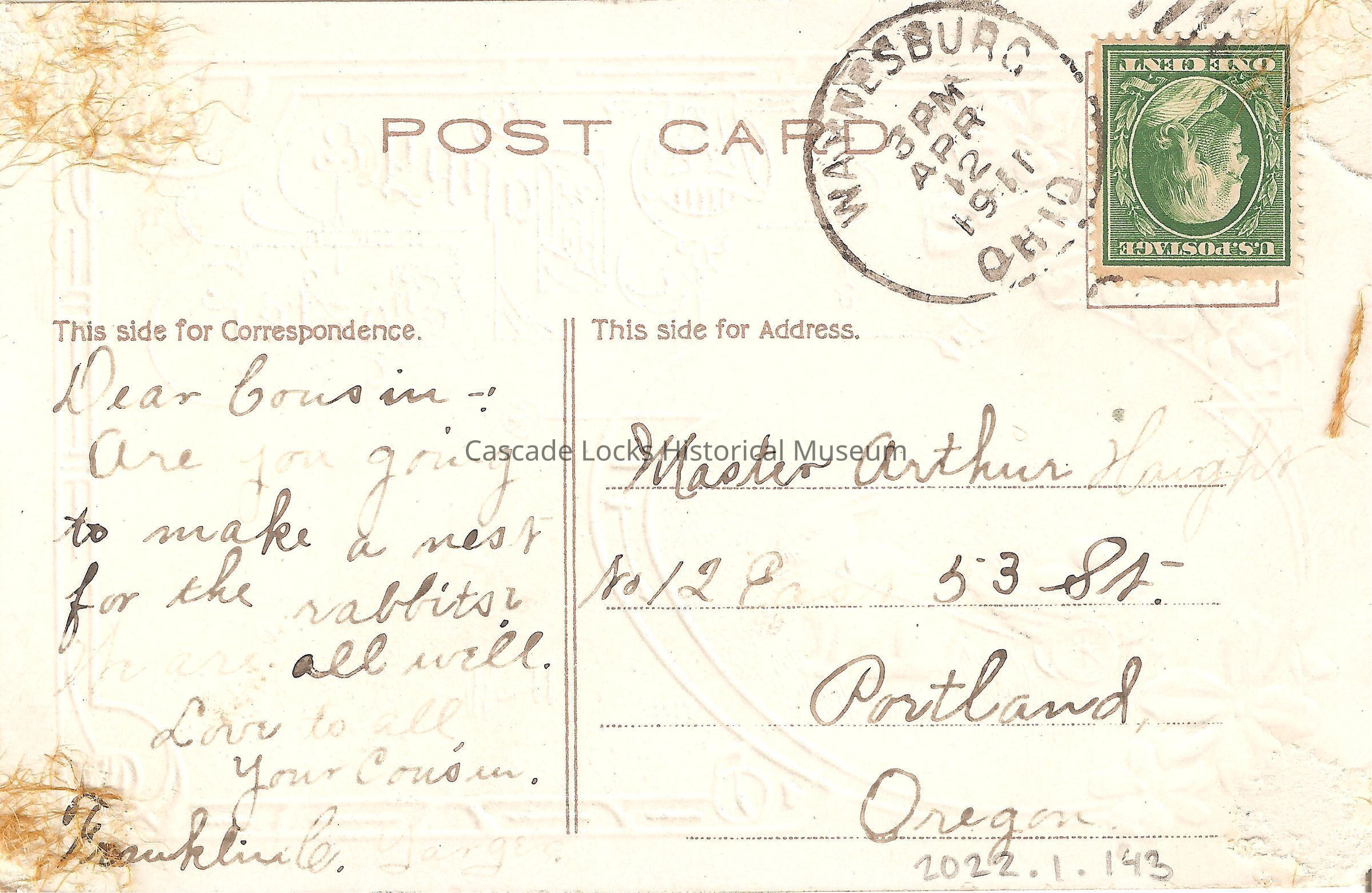 Back of image reads, "Post Card, This side for Correspondence- Dear Cousin- Are you going to make a nest for the rabbits? We are all well. Love you all, your cousin- Franklin C. This side for Address- Master Arthur Haight, No. 12 East 53 St, Portland, Ore. Waynesburg, Ohio. 3PM, Apr 12, 1910. U.S. Postage, One Cent."Lexicon