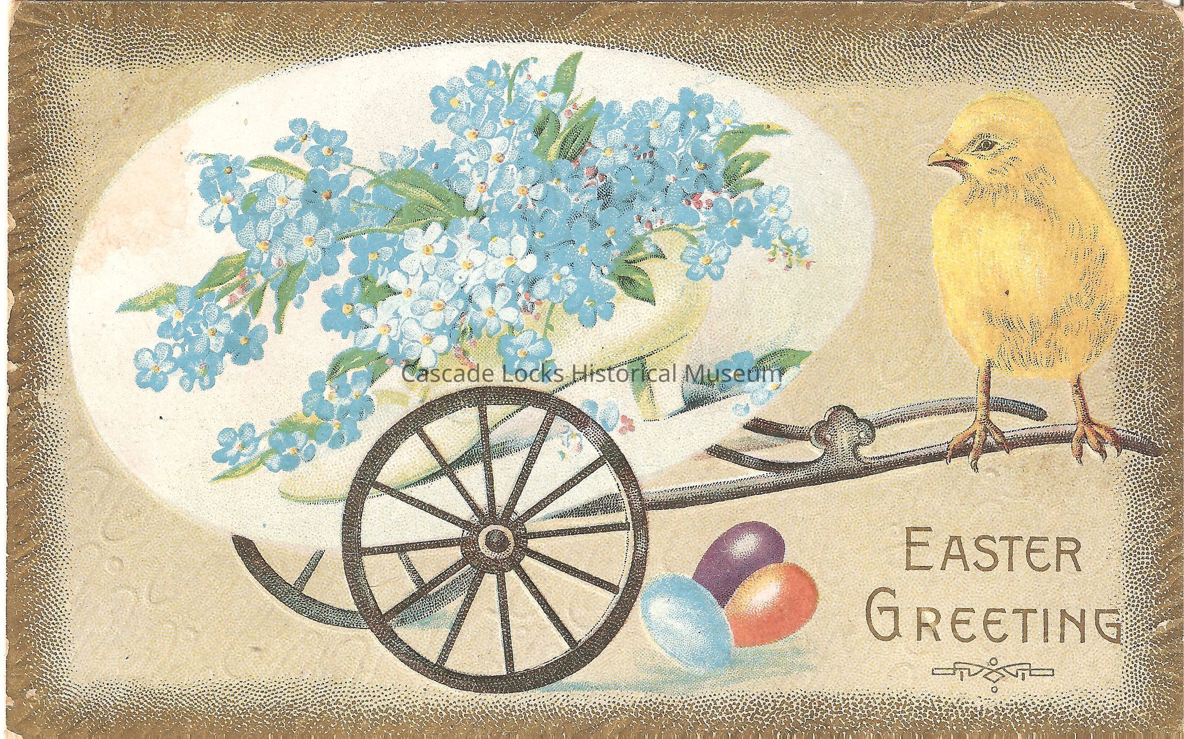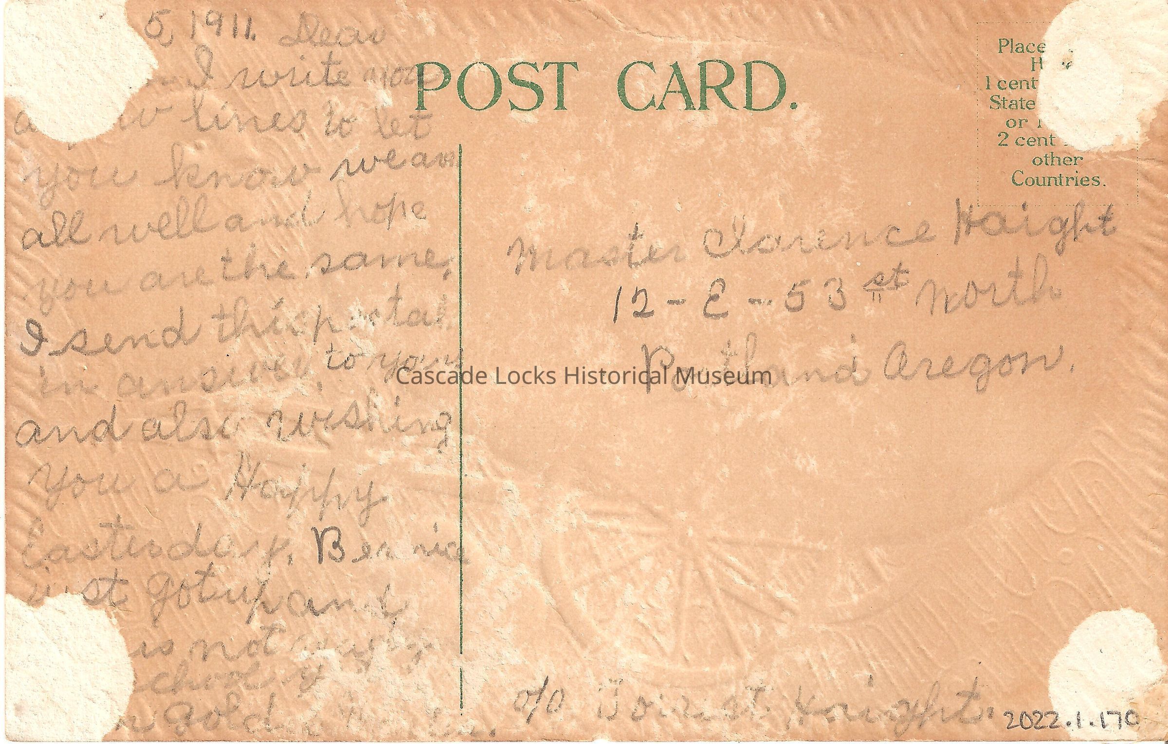 Back of image reads, "Post Card. 5, 1911. Dear (?) I write (?) lines to let you know we are all well and hope you are the same. I send this (?) in answer to you and also wishing you a Happy Easterday (?). Master Clarence Haight, 12 E 53 St North, Portland, Oregon. c/o Forest Haight. Place Stamp Here, 1 Cent United States or Canada, Two Cents other Countries."Lexicon