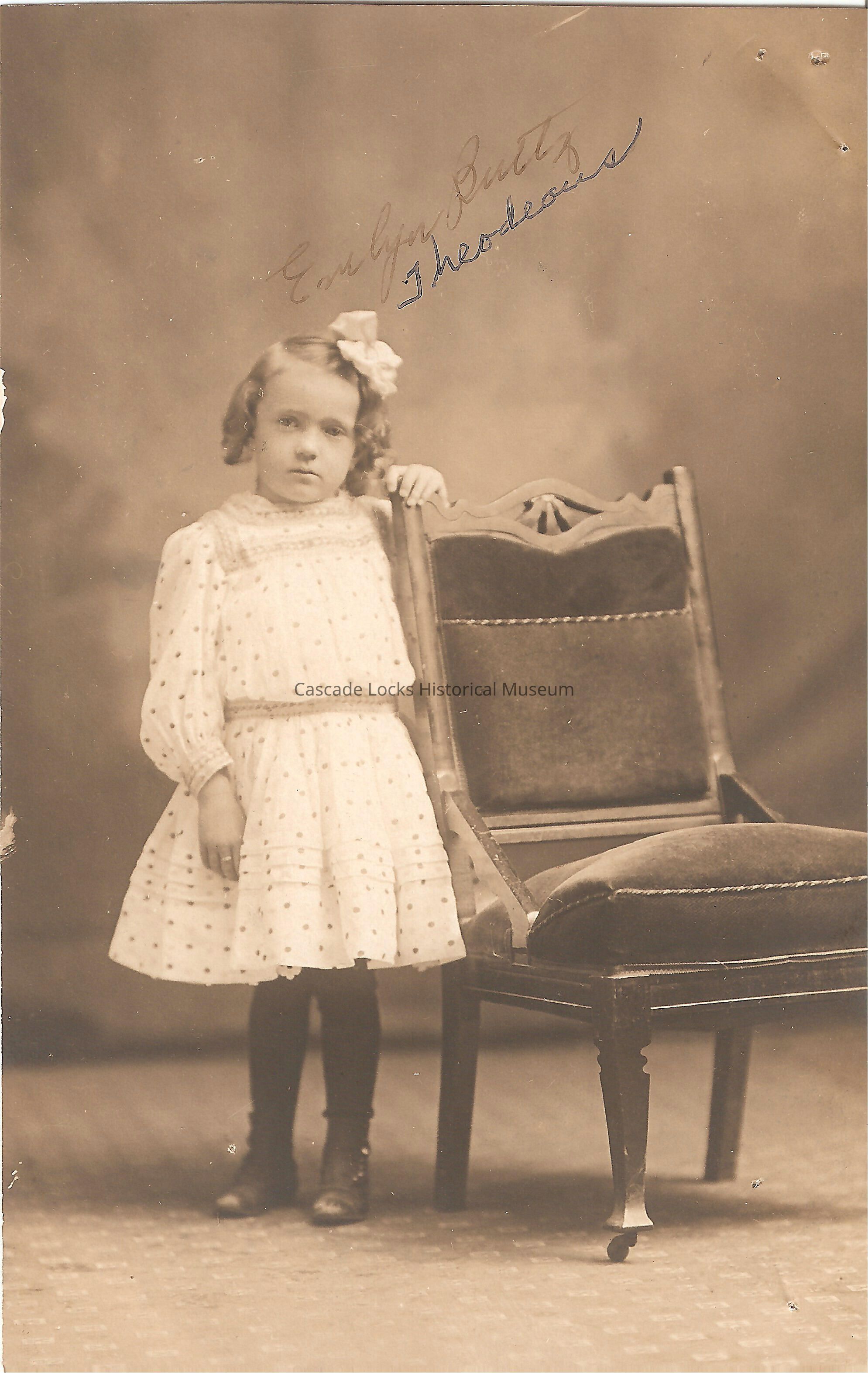 Postcard, photograph image of of a young girl in a light/white dress standing next to a chair. Image reads, "Evelyn Buttz Theodeaus."
