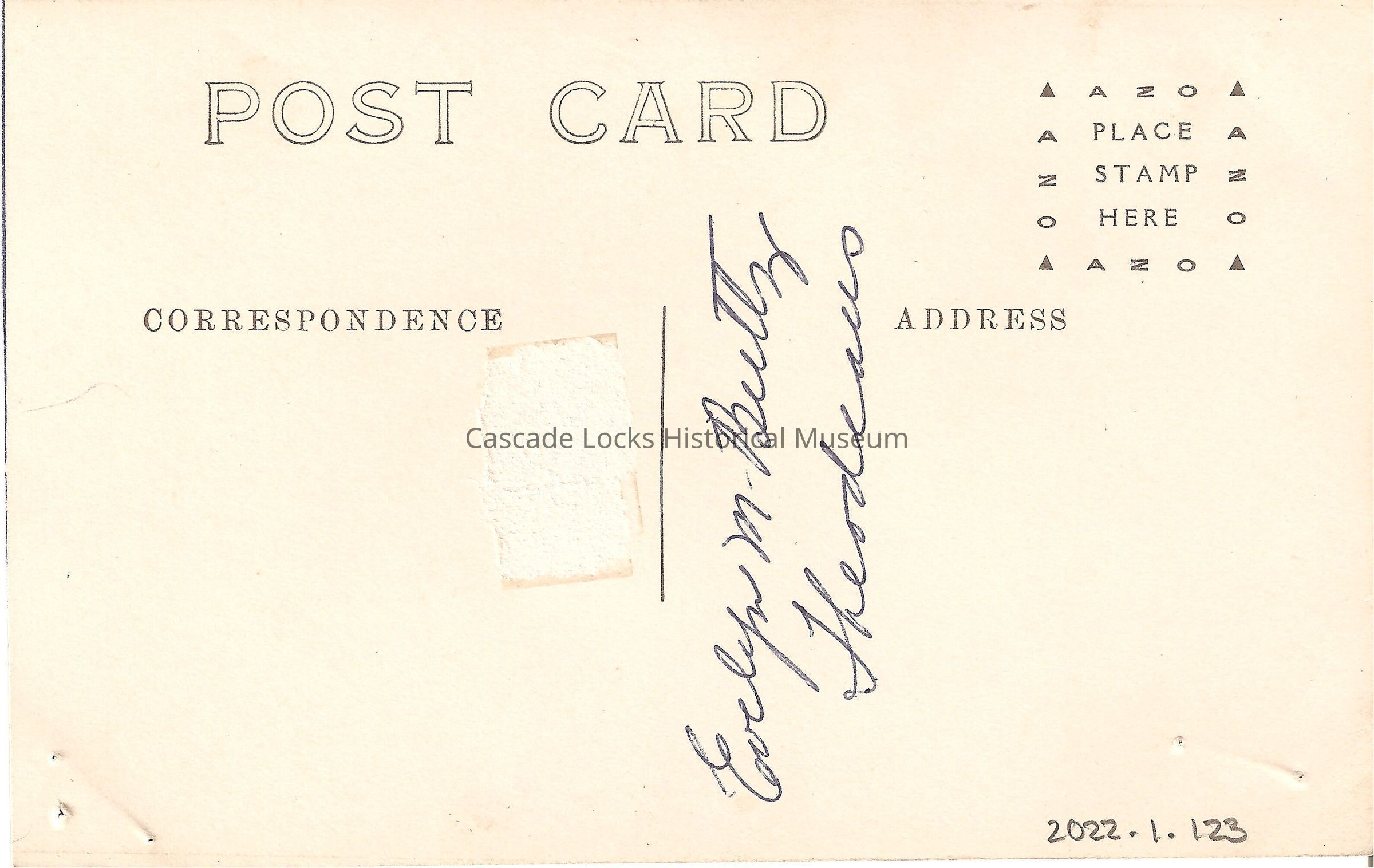 Back of image reads, "Post Card, Correspondence. Address. Evelyn Buttz Theodeaus. Place Stamp Here. AZO."Lexicon