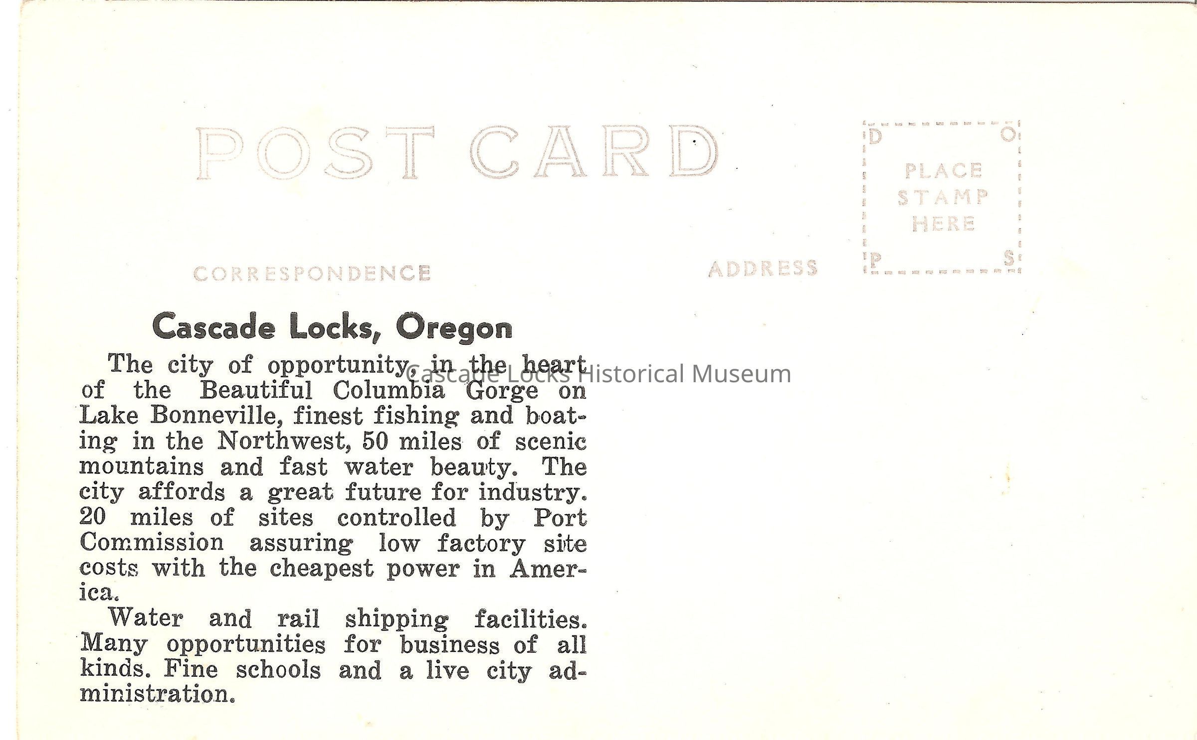 Back of image reads, "Post Card, Correspondence- Cascade Locks, Oregon. The city of opportunity, in the heart of the Beautiful Columbia Gorge on Lake Bonneville, finest fishing and boating in the Northwest, 50 miles of scenic mountains and fast water beauty. The city affords a great future for industry. 20 miles of sites controlled by Port Commission assuring low factory site costs with the cheapest power in America. Water and rail shipping facilities. Many opportunities for business of all kinds. Fine Schools and a live city administration. The Mid-Columbia Print. Address. Place stamp Here."Lexicon