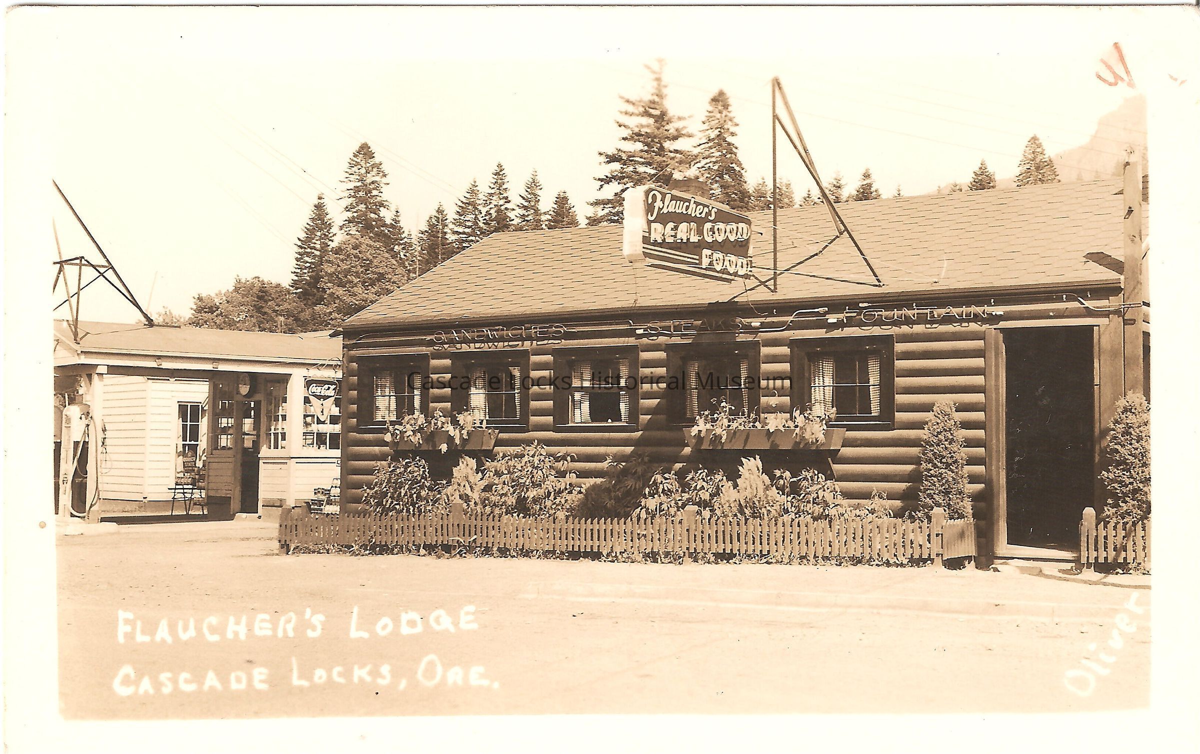 Postcard, photograph image of Flaucher's Lodge, Cascade Locks, Ore. Oliver.